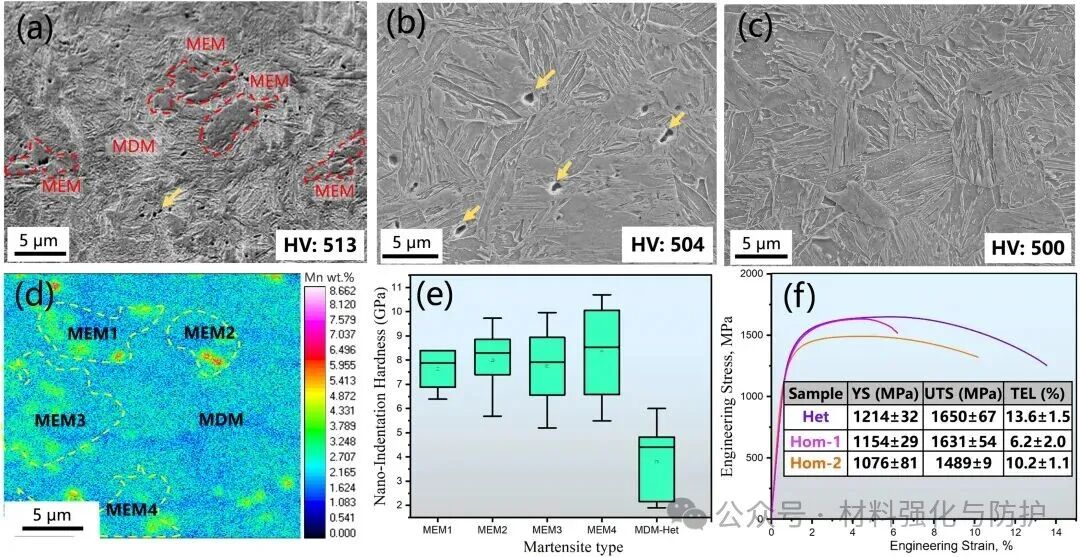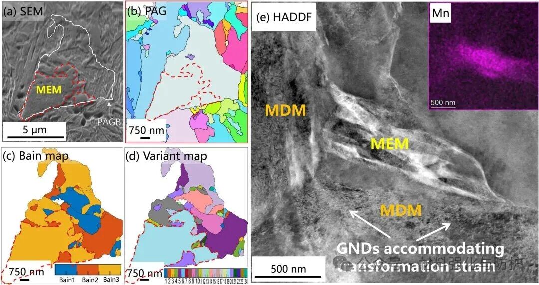 在Het样品中观察到两种类型的马氏体相:Mn贫化马氏体(MDM)与Mn富集马氏体(MEM),MDM具有多取向变体,而MEM则受限于单一取向变体,这种显著的晶体学差异导致MDM/MEM界面处产生GNDs,相比之下,对照组显示出均匀的马氏体组织,没有明显的结构区别。