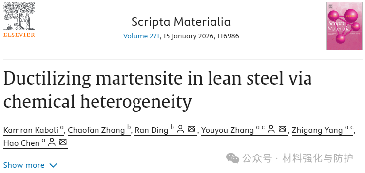 研究人员们不断试图开发更便捷的方法,近年来化学异质性在钢中引入强-韧协同的潜力开始被人们发现,特别是锰元素的分布调控。但该方法究竟能否在不依赖残余奥氏体的情况下,仅凭马氏体内部的化学异质性就能够实现强塑性的协同,这一点在之前的研究中还未明确阐明。清华大学与天津大学的联合团队于2025年9月15日在国际材料领域期刊《Scripta Materialia》在线发表的题为“Ductilizing martensite in lean steel via chemical heterogeneity”的研究论文给出了答案,该论文的通讯作者为天津大学丁然副教授和清华大学的张游游博士以及陈浩教授。