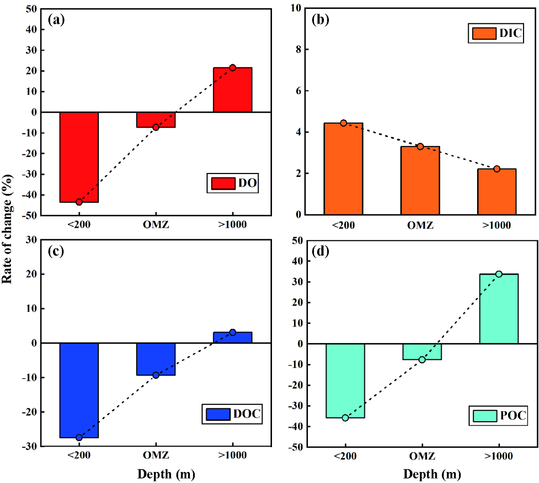 研究的重要发现是,DO在有机碳向无机碳的转化过程中起着决定性作用,OMZ的内部DOC和POC的减少速率显著低于OMZ上方的水层,表明OMZ内部的有机质降解速率远低于OMZ的上方水体,OMZ加强了有机质向下层水的输送,这可显著增强深海的碳汇强度。由此可见,大洋OMZ在深海碳汇形成上意义重大。