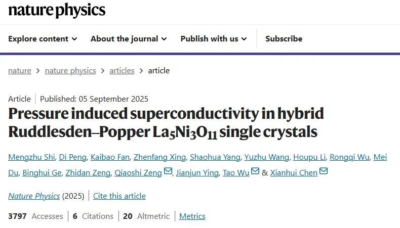 近日,中国科学技术大学陈仙辉研究团队等,在混合型Ruddlesden–Popper结构镍酸盐La5Ni3O11单晶中发现高压诱导的高温超导电性。这一新结构超导体拓展了镍基高温超导体材料家族,为高温超导机理研究提供了新的材料体系。