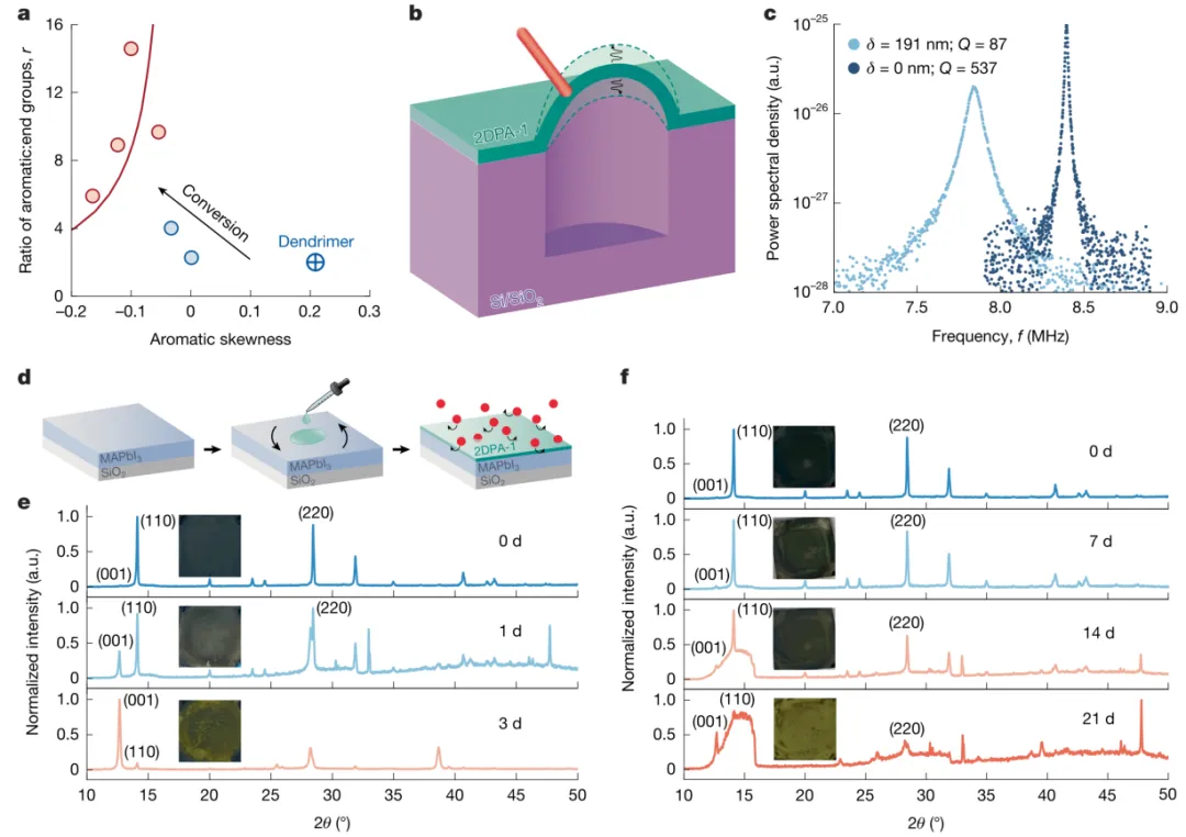 传统聚合物因链间自由体积存在,均具有气体渗透性,即使自由体积最小的液晶聚合物,氮气渗透率也仅约 10⁻⁵ Barrer;而石墨烯等二维材料因紧密堆积无自由体积,可实现分子级阻隔,但需高温生长且手动转移,限制了其作为阻隔材料的应用。溶液合成具有分子阻隔性的二维聚合物,既能结合传统聚合物的可加工性,又能兼具二维无机材料的低渗透性,是长期以来的研究目标。 近日,麻省理工学院 Michael S. Strano教授、波士顿大学 J. Scott Bunch教授(共同通讯作者)合作成功制备出了一种自支撑的二维聚芳酰胺纳米膜,其氮气渗透性低于3.1×10⁻⁹ Barrer,比现有所有聚合物低近四个数量级,并对氦气、氩气、氧气、甲烷和六氟化硫等多种气体表现出同样优异的阻隔性能。该材料不仅可用于制造高频谐振器,还能作为超薄保护层显著延缓空气敏感钙钛矿材料的降解,展现出广阔的应用前景。 2025年11月12日,相关论文以“A molecularly impermeable polymer from two-dimensional polyaramids”为题发表在Nature上。 图文介绍 首先合成了名为2DPA-1的二维聚芳酰胺材料,并将其分散后旋涂成纳米薄膜。图1展示了2DPA-1纳米片的结构与形貌:理论模型揭示了其单层片状结构与层间紧密堆积的特性;透射电子显微镜图像显示纳米片直径约为10纳米,均匀分散于石墨烯支撑的网格上;扫描透射电子显微镜进一步证实了薄膜具有层状有序排列,层间距为 3.3 ± 0.2埃。当这些薄膜被转移到硅基微孔阵列上时,可形成向上凸起或向下凹陷的稳定结构,其偏转高度可通过原子力显微镜精确测量,显示出优异的机械强度和界面密封性能。 图1. 2DPA-1 的结构与薄膜鼓泡特性。a. 为 2DPA-1 单层纳米片理论结构;b. 为 TEM 下分散在石墨烯支撑网格上的 2DPA-1 纳米片;c. 为 2DPA-1 薄片理论结构(含少量空隙);d. 为 STEM 下旋涂薄膜边缘的 2DPA-1 薄片排列;e. 为 d 图的强度分布;f、i. 为薄膜挠度横截面示意图(f 为正向鼓泡,i 为负向凹陷);g、j. 为正向鼓泡和负向凹陷的光学显微镜图;h、k. 为 g、j 对应的 AFM 图及挠度剖面。 为了验证其分子不可渗透性,利用微孔凸起实验进行了长期气体阻隔测试。图2记录了在氮气加压条件下,薄膜从初始凹陷状态逐渐充气形成稳定凸起的动态过程。光学干涉技术使研究人员能够实时追踪薄膜偏转变化,发现即使在110天内,充有150 kPa氮气的凸起也未发生明显泄气。通过计算,2DPA-1薄膜的氮气渗透性上限被确定为3.1×10⁻⁹ Barrer,接近完美石墨烯的阻隔水平,且远低于所有已知液晶聚合物。 图2. 氮气渗透性测量与凸起持久性。a. 为 2DPA-1 凹陷在氮气加压前后的挠度变化(白色点为 AFM 数据,红色点为光学干涉数据)及不同时间的鼓泡剖面;b. 为氮气渗透率与结晶度的关系(含多种传统聚合物数据对比)。 除了氮气,该材料对六氟化硫、氩气和甲烷等其他气体也表现出类似的不可渗透性。图3显示了这些气体所形成的凸起在长时间内偏转仅出现微小随机波动,均方位移分析表明其行为符合受限扩散模型,进一步证实气体并未透过薄膜逸出。特别值得注意的是,这些凸起在长达三年内仍保持稳定,说明2DPA-1材料不仅本身无渗透路径,还不会因吸湿或物理老化而丧失屏障功能。 图3. 不同气体凸起偏转随时间的随机波动。 a-d. 为氮气、六氟化硫、氩气、甲烷填充鼓泡的归一化挠度随时间变化;e-h. 为 4 个 2DPA-1 鼓泡挠度的均方根位移(MSD)分析;i. 为初始挠度对数与约束长度平方对数的线性关系。 在实际应用方面,图4展示了2DPA-1在纳米机电系统和光伏封装中的潜力。通过调控合成过程中芳环与端基的比例,可制备出具有不同尺寸和机械强度的纳米片,其中大尺寸纳米片能形成均匀稳定的悬浮薄膜。这些薄膜在真空中表现出高达8 MHz的共振频率和537的品质因子,媲美石墨烯谐振器。此外,将60纳米厚的2DPA-1涂层旋涂于甲基铵铅碘钙钛矿表面,可将其在空气中的降解时间从3天延长至21天,相当于将晶格降解速率降低了14倍。通过降解动力学模型推算出其氧气渗透性为3.3×10−8Barrer,再次验证了其作为高效屏障材料的可行性。 图4. 2DPA-1的实际应用拓展。a. 为芳香族与端基比例(r)与芳香族偏斜度(s)的关系;b. 为 2DPA-1 薄膜作为纳米机电谐振器的示意图;c. 为 35 nm 厚 2DPA-1 谐振器的功率谱密度;d. 为 2DPA-1 旋涂封装 MAPbI₃的示意图;e. 为未涂覆 2DPA-1 的 MAPbI₃在空气中的 XRD 谱图(随时间变化);f. 为涂覆 60 nm 2DPA-1 的 MAPbI₃在空气中的 XRD 谱图(随时间变化)。 总之,论文创新性主要体现在三方面:①突破传统聚合物阻隔性能瓶颈:首次通过溶液相缩聚合成具有分子级阻隔性的二维聚芳酰胺(2DPA-1),氮气渗透率低于 3.1×10⁻⁹ Barrer,比现有最低渗透聚合物低近四个数量级,性能比肩石墨烯,同时保留传统聚合物的溶液可加工性,解决二维无机材料难加工、需高温生长的问题;②揭示新型阻隔机制:提出 “交错堆积 + 位阻能垒” 协同机制,通过薄片交错堆积减小有效孔径,结合高传输能垒抑制气体分子穿越,而非依赖传统聚合物的高结晶度,且通过调控端基比例(r)可实现薄膜机械稳定性与阻隔性的精准匹配;③拓展二维聚合物应用场景:首次将二维聚芳酰胺用于纳米机电谐振器(品质因数达 537)和钙钛矿封装(降解速率降低 14 倍),证实其在高频器件、光电子防护等领域的实用价值,为下一代阻隔材料与功能器件设计提供新范式。 原文链接 https://doi.org/10.1038/s4