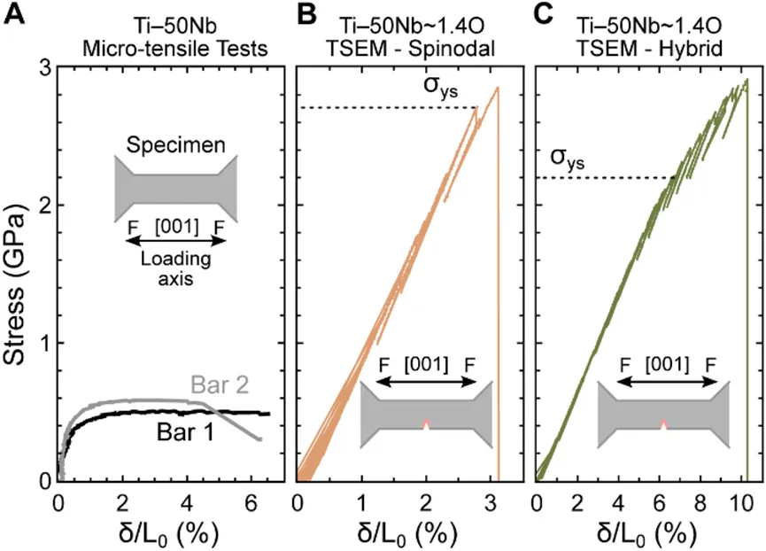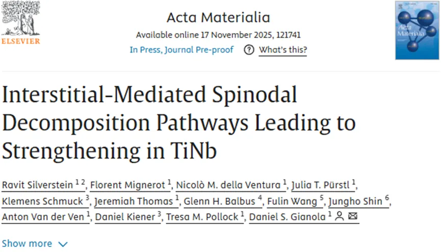 近日美国加州大学研究人员向等摩尔的TiNb合金中,加入了大约1%原子比的氧,再通过特定热处理让合金内部发生“相分解”,使合金抗拉强度超2GPa,同时保持约8MPa·m0.5的中等断裂韧性。相关研究结果以“Interstitial-Mediated Spinodal Decomposition Pathways Leading to Strengthening in TiNb”为题被发表在期刊《Acta Materialia》上。