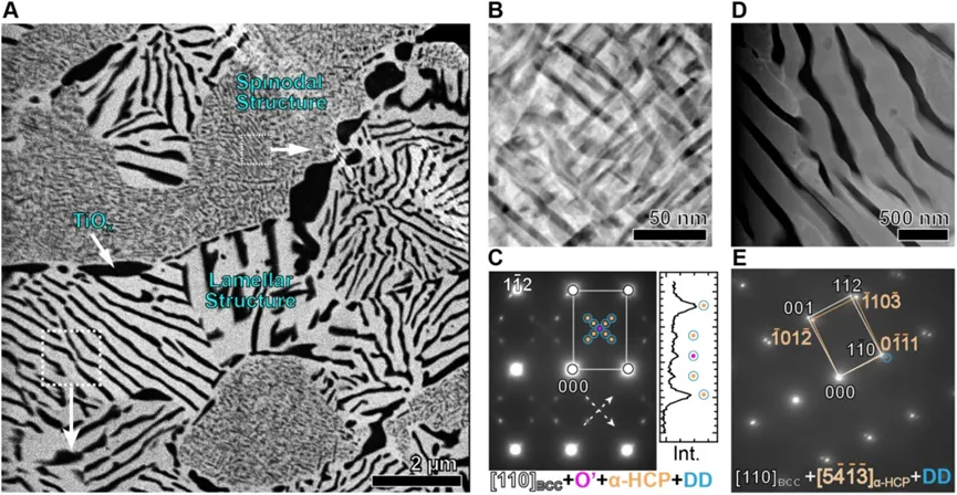 通过向等摩尔的TiNb合金中引入约1%原子比的间隙氧,并结合800℃的特定热处理,成功诱导合金从初始均一的体心立方(BCC)相发生相分解,形成两种关键纳米结构:一是Ti/Nb富集的调幅结构,其成分呈周期性波动,周期为40-100nm,二是富Ti六方相(α-HCP)和富Nb BCC相交替的层状结构。