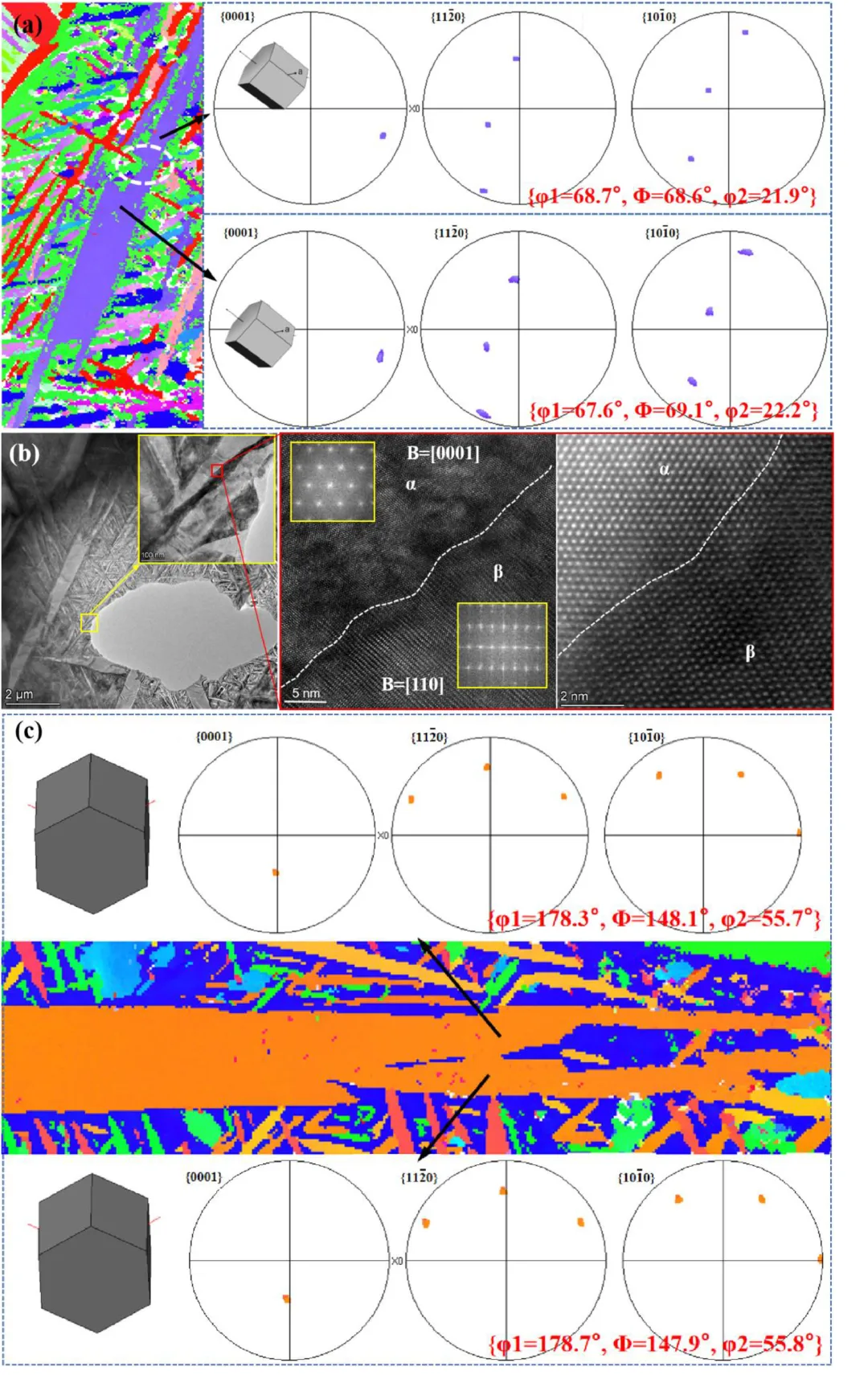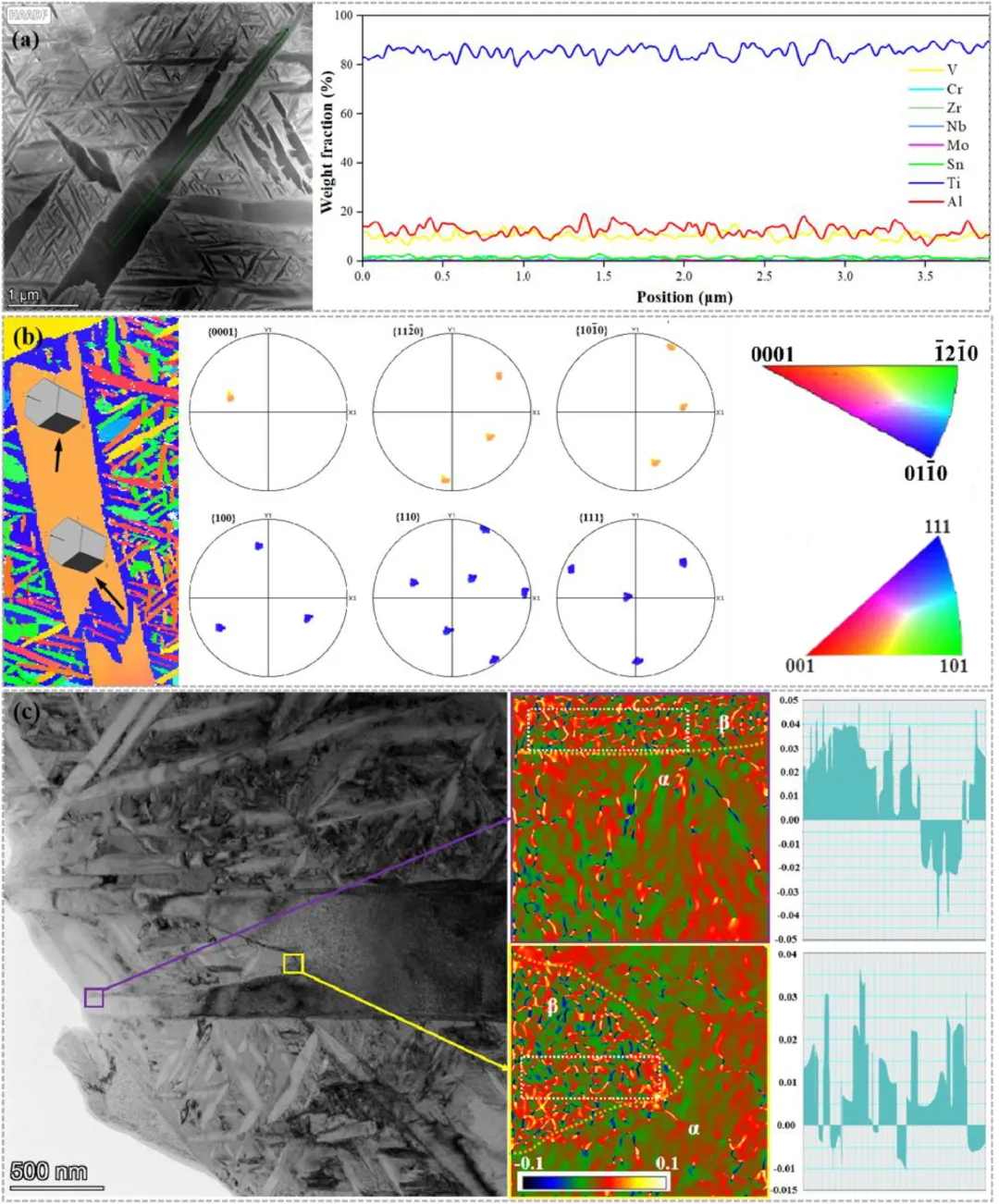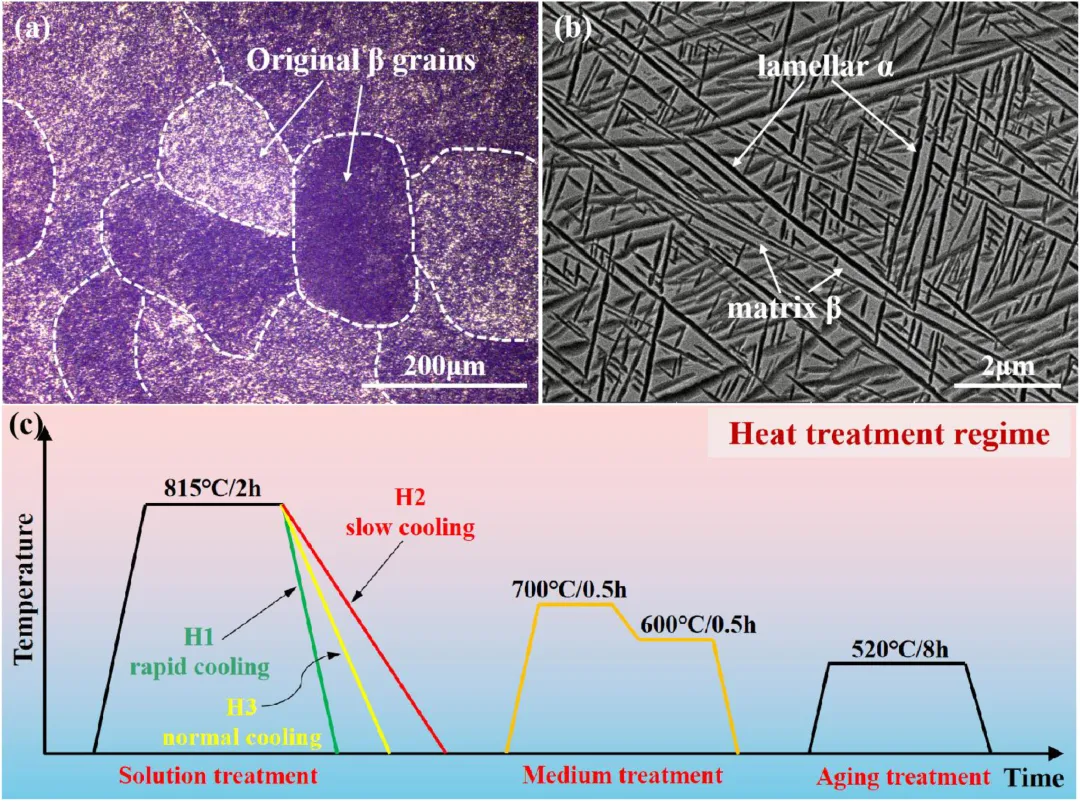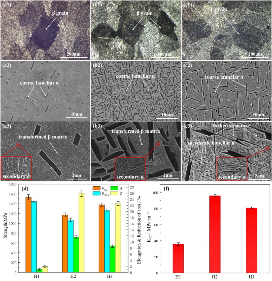团队首先利用高温固溶过程重新分配β相与α相的体积分数与尺寸,在固溶结束后,将三种不同冷却速度的样品分别标记为计H1、H2、H3(H1:快速冷却,H2:中速冷却;H3:缓慢冷却);随后通过中温退火调节初生α与中尺度α的形貌连接特征;最终通过时效过程析出高密度的二级α以实现强化。在组织表征方面,研究者借助OM、SEM、EBSD、TEM、TKD等手段对晶体取向、相界关系、析出相尺寸与分布进行了系统研究,并通过HRTEM分析组织演化细节。在性能测试方面,研究团队进行了室温拉伸、断裂韧度测试以及断口分析,结合位错结构观察揭示不同组织在变形过程中的贡献机制。