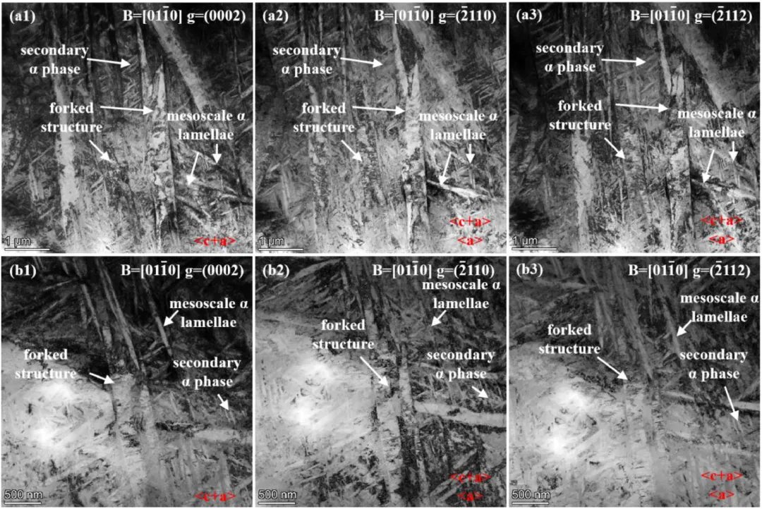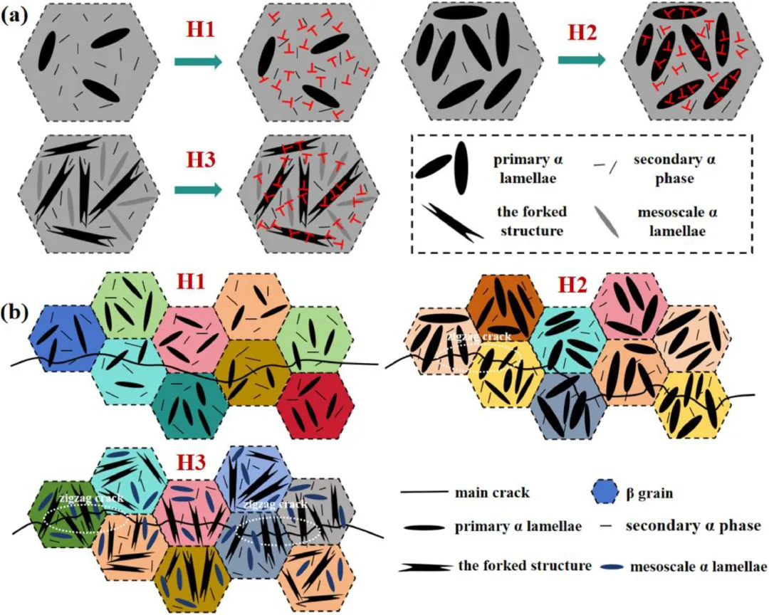 三种样品的微观结构呈现出明显差别,H1组织以时效过程中析出的细小次生α相为主;H2组织发展出较为连续的中尺度α层片,初生α形貌趋于规则;而H3组织最为特别,具体表现为形成了叉状结构,结构特征是多个方向一致的α层片在端部合并、延伸并产生分叉形态,该结构的形成来源于α层片的外延生长、相邻层片的连接延伸以及同向层片的合并粗化。