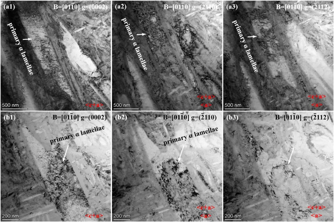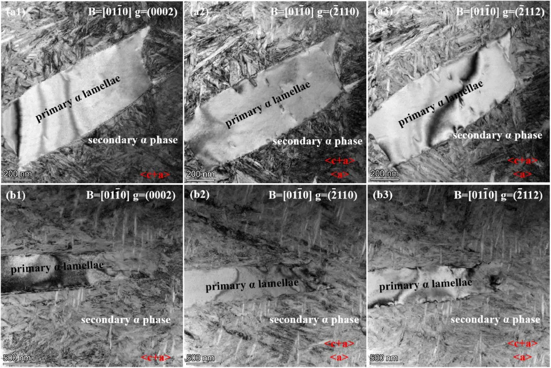 三种状态的合金在变形过程中的位错行为也有显著区别,该区别本质上源于三种合金的微观结构差异,H1组织的位错主要被次生α相阻挡,导致应力集中严重,大大削弱了合金的变形能力;H2中初生α能较好的容纳位错,因而塑性最佳;而在H3中,叉状α的端部区域能够容纳大量位错,中尺度α提供良好的滑移传播路径,次生α则在强化的同时保持一定的相界协调性,多尺度结构之间的错配度适中,使位错既能累积又不容易形成过度堆积,从而在宏观上提高应变硬化能力,延缓颈缩的发生。