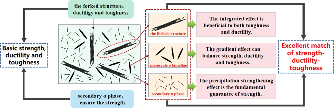 研究提出的核心思路是通过三步热处理,在TB17钛合金中构筑由“叉状α结构”“中尺度α层片”“细小二级α”共同组成的多尺度复合组织。叉状结构提供了更大的形变缓冲能力,中尺度α增强滑移协调性,而二级α负责维持高强度。三类组织在不同变形阶段发挥互补作用,使材料呈现出类似梯度结构的行为特征,从而改善应变分配、延缓局部失稳,并显著提高裂纹偏折能力。通过这种组织共生策略,材料的强度、塑性与断裂韧性得以同时提升。