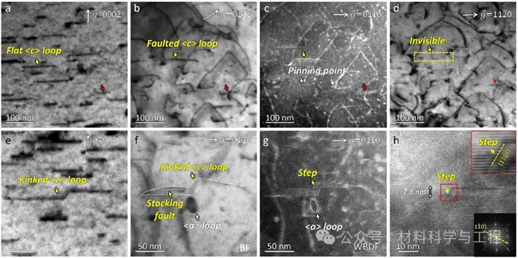 图2. 平面与三维〈c〉位错环的详细表征。 (a-d) 同一区域内基面〈c〉位错环在不同衍射矢量下的TEM图像。红色和黄色箭头分别标记了在不同衍射矢量下同一位错环衬度。(e-g) 同一区域内三维〈c〉位错环在不同衍射矢量下的TEM图像。(h) 三维〈c〉位错环台阶高度的高分辨TEM图像。