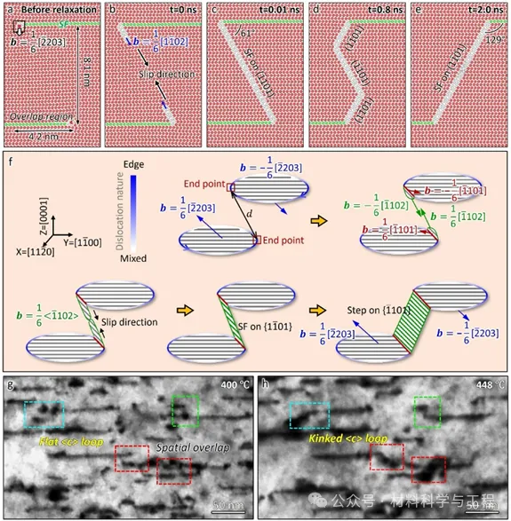 图3. 三维弯折〈c〉位错环的形成过程。 (a-e) 基于分子动力学模拟得到的两个相邻〈c〉位错环之间的相互作用,导致了弯折〈c〉位错环的形成。 (f) 弯折〈c〉位错环的演化过程示意图。 (g) 400°C时基面〈c〉位错环的高倍TEM图像。(h)在448°C退火后,这些平面〈c〉位错环演变为弯折结构。