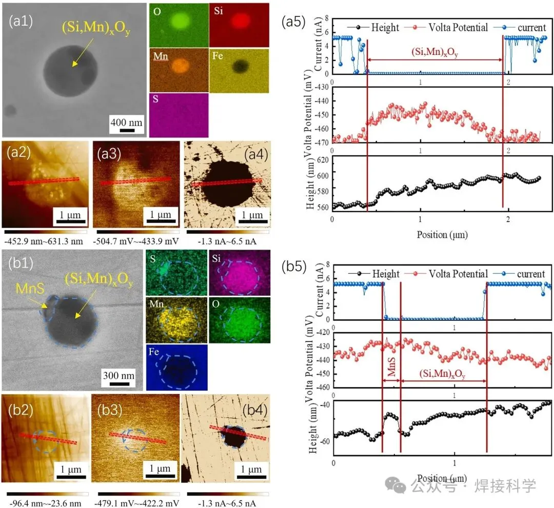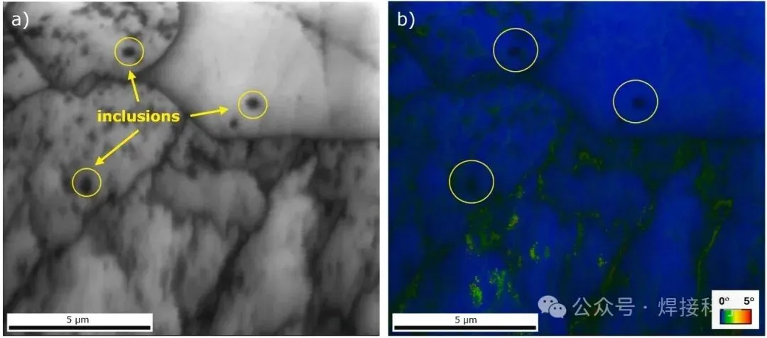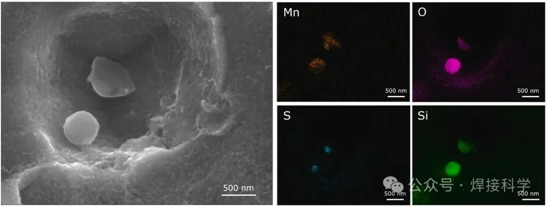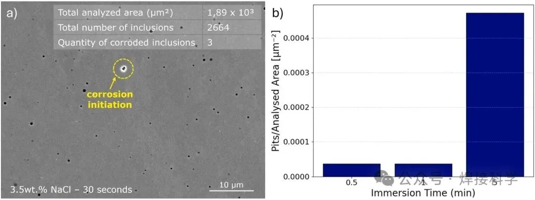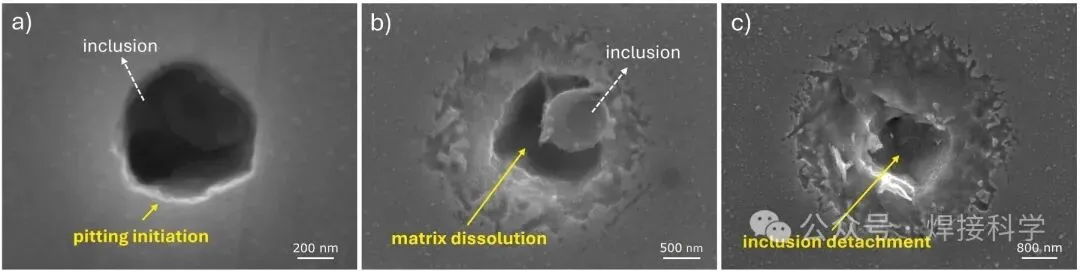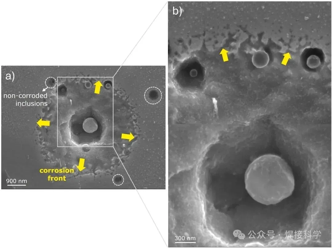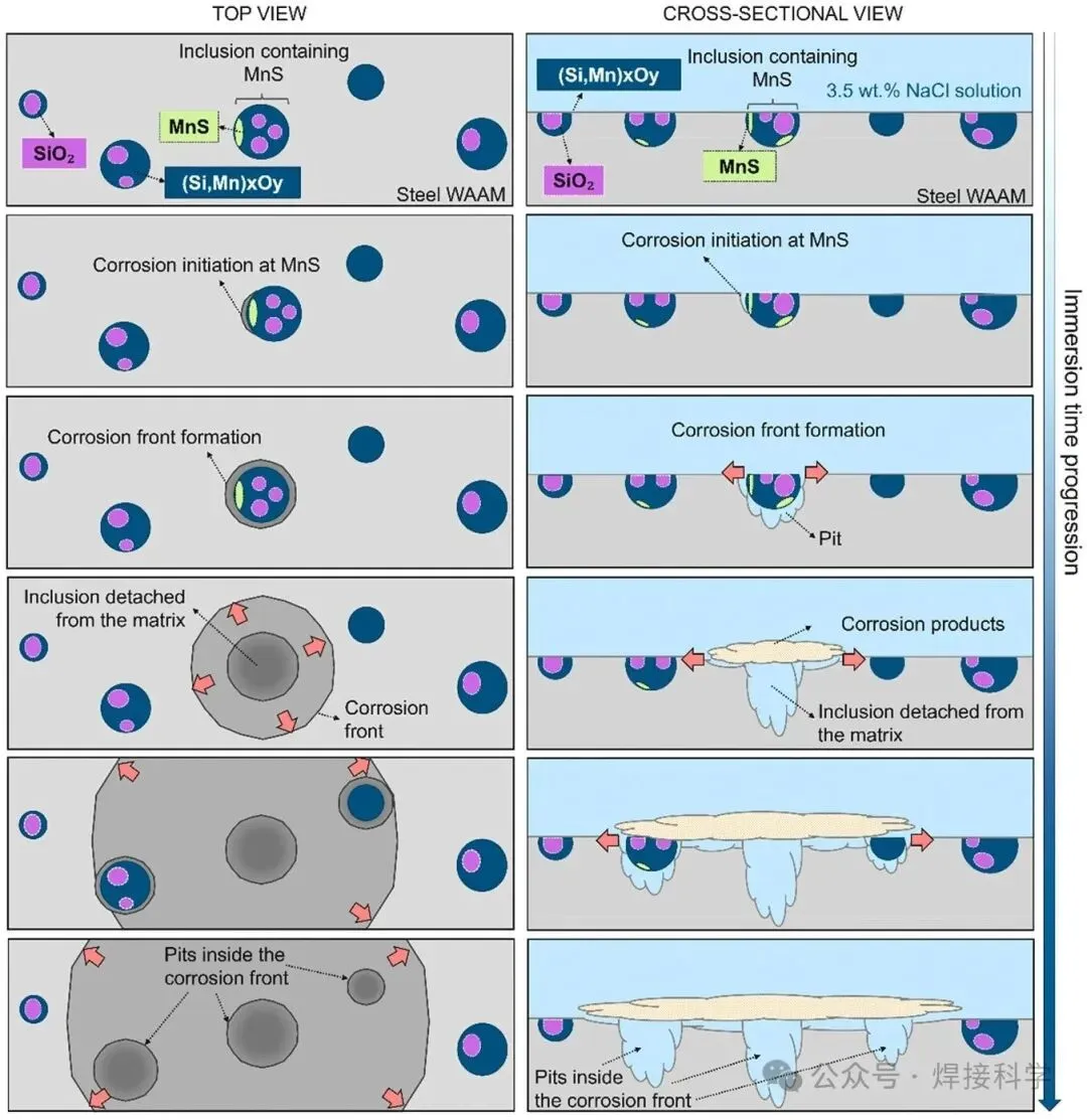 2025年11月27日,比利时布鲁塞尔自由大学可持续材料工程研究小组的研究团队在《Corrosion Science》期刊发表最新研究文章“Role of non-metallic inclusions in the initiation and propagation of corrosion in wire arc additive manufactured low-alloy steel”,研究了电弧增材制造(WAAM)低合金钢在海洋环境中的早期腐蚀行为,重点探究了非金属夹杂物对腐蚀萌生和扩展机制的影响。 该研究探究了电弧增材制造(WAAM)低合金钢的早期腐蚀行为。研究人员将试样暴露于海洋环境中,考察了非金属夹杂物对腐蚀的影响。尽管由于快速凝固,锰硅酸盐在增材制造钢中较为常见,且在某些增材制造钢种(如不锈钢)中通常被认为对腐蚀呈惰性,但在该研究的WAAM低合金钢中,这些夹杂物可能含有富MnS的微小区域。由于其化学不稳定性,这些富MnS区域成为点蚀萌生的优先位点。随着在海洋环境中暴露时间的增加,富MnS区域周围的金属基体发生局部溶解,导致夹杂物脱落和点蚀形成,随后形成周围的圆形腐蚀前沿。该前沿逐渐扩展,包裹并脱落相邻的夹杂物,最终从局部腐蚀转变为全面腐蚀。 实验方法 该研究以ER90S-G焊丝通过电弧增材制造(WAAM)制备的低合金钢为研究对象,其化学组成包含C、Si、Mn、Cr、Mo、V等元素,Fe为基体元素。采用扫描电子显微镜(SEM)、电子背散射衍射(EBSD)、能谱仪(EDS)、扫描开尔文探针力显微镜(SKPFM)、电流传感原子力显微镜(CSAFM)对材料的微观结构、夹杂物的分布、尺寸、形态及化学成分等进行表征;通过动电位极化试验对比WAAM钢与传统锻造钢的耐腐蚀性;采用3.5wt%NaCl溶液模拟海洋环境进行浸泡试验,探究不同浸泡时间(30秒、1分钟、5分钟、30分钟)下的腐蚀萌生与扩展过程;借助微毛细管技术,在施加0.2%拉伸应变的条件下进行应力辅助腐蚀试验,观察裂纹萌生情况。 论文图片 图1.(a)WAAM沉积过程的示意图,突出显示了扫描策略;(b)用于材料分析的试样提取方式。 图2.(a)显示WAAM试样中夹杂物分布的场发射扫描电子显微镜(FE-SEM)图像;(b)夹杂物数量与其直径的关系图。 图3.WAAM制备的ER90S-G钢中的典型夹杂物,由(Si,Mn)ₓOᵧ组成:(a)含有微小MnS区域的夹杂物;(b)未检测到硫含量的夹杂物。示意图中标注了已识别的区域:SiO₂、(Si,Mn)ₓOᵧ和MnS。 图4.传统钢和WAAM钢试样在0.1M NaCl溶液中的动电位极化曲线。 图5.(a)在3.5wt%NaCl溶液中浸泡30秒后的扫描电子显微镜(SEM)图像,可见夹杂物处的腐蚀萌生。表格总结了所分析的夹杂物及出现点蚀的夹杂物情况;(b)点蚀密度随在3.5wt%NaCl溶液中浸泡时间的变化关系。 图6.试样在3.5wt%NaCl溶液中浸泡30秒后不同区域的扫描电子显微镜(SEM)图像,展示了腐蚀的初始阶段:(a)夹杂物周围的点蚀萌生;(b)通过夹杂物相邻钢基体的溶解导致点蚀加深;(c)夹杂物脱落。注:在30秒的浸泡时间内,同一试样上已能观察到这三个阶段。 图7.试样在3.5wt%NaCl溶液中浸泡30秒后的扫描电子显微镜(SEM)图像,展示了局部腐蚀形成的早期阶段:(a)黄色大箭头指示腐蚀前沿的形成,白色虚线圆圈突出显示尚未发生腐蚀的夹杂物;(b)点蚀中心的放大图,捕捉到特定夹杂物处的腐蚀萌生以及被腐蚀前沿触及并开始脱落的夹杂物。 图8.试样在3.5wt%NaCl溶液中浸泡30秒后的扫描电子显微镜(SEM)图像,显示腐蚀始于含硫夹杂物的点蚀中心(通过能谱仪(EDS) mappings确认)。 图9.在3.5wt%NaCl溶液中浸泡试验后局部腐蚀萌生和扩展的图像,按浸泡时间分组:(a,b)30秒;(c,d)1分钟;(e,f)5分钟;(g,h)30分钟。每个时间间隔均同时呈现低倍和高倍图像,左侧为低倍图像,右侧为高倍图像。 图10.含三个所研究夹杂物区域的电子背散射衍射(EBSD)分析:(a)场发射枪扫描电子显微镜(FEG-SEM)图像;(b)同一区域的晶粒平均取向差(KAM)图。 图11.通过场发射扫描电子显微镜-能谱仪(FE-SEM-EDS)(1)、形貌图(2)、伏特电位图(3)、电流图(4)以及线扫描图谱(5)对夹杂物进行的分析(通过扫描开尔文探针力显微镜(SKPFM)和电流传感原子力显微镜(CSAFM)获得):(a)未检测到硫含量的夹杂物;(b)含有MnS的夹杂物。 图12.利用FactSage软件计算得到的298.15K下Mn-S-H₂O体系的Pourbaix图(电位-pH图)。 图13.场发射扫描电子显微镜(FE-SEM)图像,展示了试样在3.5wt%NaCl溶液中浸泡后施加拉伸载荷的腐蚀形貌和裂纹形成情况,浸泡时间分别为:(a)30秒;(b)5分钟;(c)30分钟。 图14.WAAM制备的低合金钢在NaCl溶液中浸泡后早期腐蚀阶段的示意图。左侧图示为俯视图,右侧图示为横截面图。从上到下,依次展示了浸泡时间的推移过程,突出显示了试样中不同类型夹杂物的存在,腐蚀始于含MnS的区域,并通过腐蚀前沿的扩展向其他夹杂物蔓延。 论文总结 该研究探究了电弧增材制造(WAAM)制备的ER90S-G钢中夹杂物在海洋环境下对腐蚀萌生和早期扩展的影响,得出以下结论: (1)该材料中的夹杂物尺寸细小且呈圆形,尺寸小于1μm(近90%的颗粒小于500nm),均匀分布于整个试样中。这些夹杂物主要为(Si,Mn)ₓOᵧ,部分还含有硫元素,表明存在MnS。 (2)腐蚀主要始于含MnS的夹杂物,点蚀优先在这些位置萌生并最终导致夹杂物从金属基体脱落。尽管并非所有夹杂物都是优先腐蚀位点,但一旦含MnS的(Si,Mn)ₓOᵧ夹杂物处形成点蚀,就会发展出圆形腐蚀前沿,并向周围先前未受影响的颗粒扩展,这些颗粒随后成为活性腐蚀位点并依次脱落。 (3)在MnS区域与周围的(Si,Mn)ₓOᵧ或金属基体之间未检测到显著的伏特电位差,且MnS表现出非导电行为。这是由于在该材