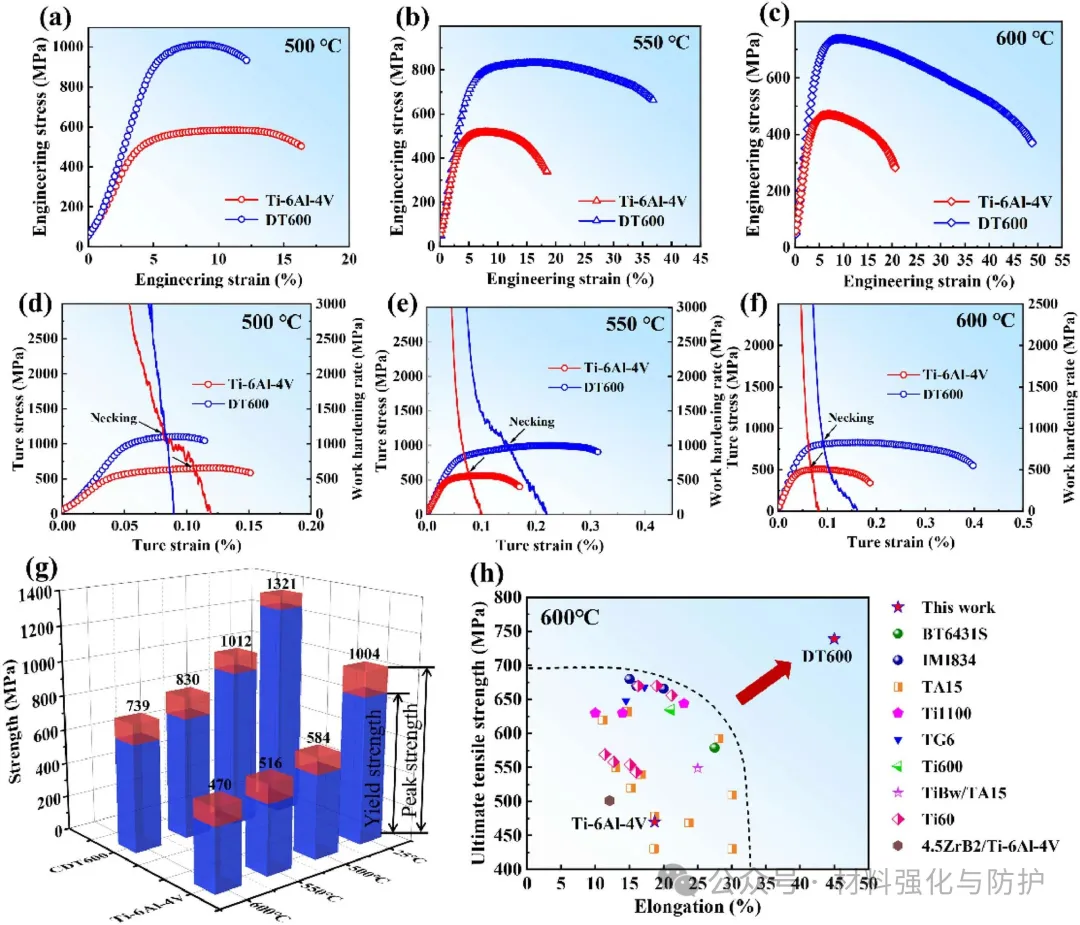 DT600在室温下具有1242MPa的屈服强度和1321MPa的抗拉强度,分别较Ti-6Al-4V提升45%和31%。在500-600℃范围内DT600的强塑协同性较目前已报道的一些常规钛合金体系具有明显优势,600℃时,DT600屈服强度(623MPa)是Ti-6Al-4V的1.7倍,同时延伸率高达46.2%。在强韧性机制方面,塑性的提升归因于动态球化机制的激活,强度提升源于固溶强化(Zr、Mo、Nb贡献268MPa)、α/β相细化(693MPa)及硅化物沉淀(59MPa),且高温下硅化物钉扎界面,有效延缓软化。