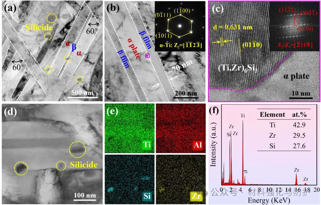 微观结构表征显示,DT600的β晶粒尺寸为119.2μm较Ti-6Al-4V细化63%,α板条宽度为0.26μm,较Ti-6Al-4V减小85%,并形成网篮组织,并且β相含量增至21vol%,硅化物在α/β界面沉淀,增强界面稳定性,尺寸~50nm的纳米硅化物为S2型(Ti,Zr)6Si3,与α板条呈60°夹角,其非共格界面可有效钉扎位错。