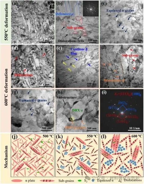 在550℃以上,DT600的α板条动态球化,形成尺寸50-100nm的亚晶,EBSD显示,550℃时低角度晶界比例增至81%,且合金在550℃变形时α板条分裂为等轴晶,硅化物抑制板条粗化,600℃时β相渗入α板条,加速球化过程。变体晶界分析表明,DT600中α变体通过自协调机制形核,因此诱发形成网篮组织和弱纹理,优化合金的高温性能。