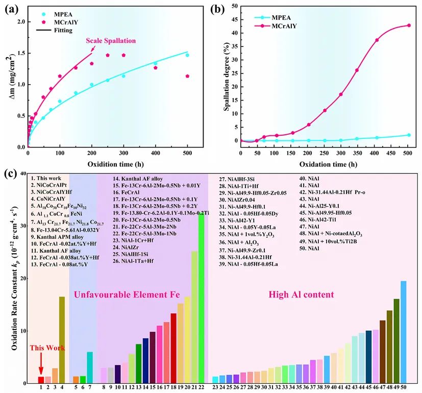 基于上述策略,团队成功研制出新型NiCoCrAlYHf多主元合金(Multi-Principal Element Alloy, MPEA)。在1200℃、500小时的等温氧化实验中,新型合金的氧化增重显著低于传统合金,其氧化速率常数仅为 1.28×10⁻¹² g²·cm⁻⁴·s⁻¹,比传统合金低约 59%。更为重要的是,在循环氧化测试中,传统合金在 70 小时后就出现氧化膜剥落,500 小时后剥落面积超过 40%,而新型合金在整个测试周期内剥落面积小于 2%,展现出卓越的膜层结合力与抗剥落性能。这一进展为发展下一代极端温度下稳定服役的热障涂层粘结层材料,奠定了关键的材料基础与设计范式。