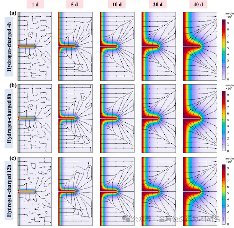 图3. 不同时长氢充注后,拉伸应力下的氢浓度与通量分布:(a)EHC 4 小时,(b)EHC 8 小时,(c)EHC 12 小时。