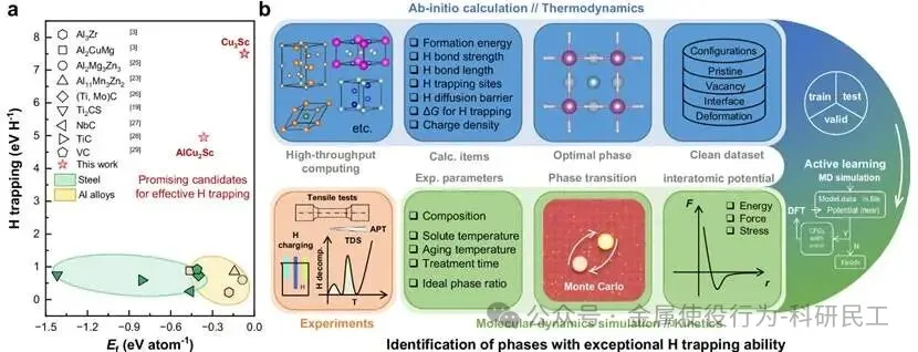 图1:强氢捕获能力相的识别策略。a 目前在钢和铝合金中已识别的氢陷阱相。红星标示出在严苛条件下形成、具有高氢捕获能力的相。b 结合第一性原理计算、机器学习原子间势、分子动力学模拟与实验验证,以识别氢陷阱相。