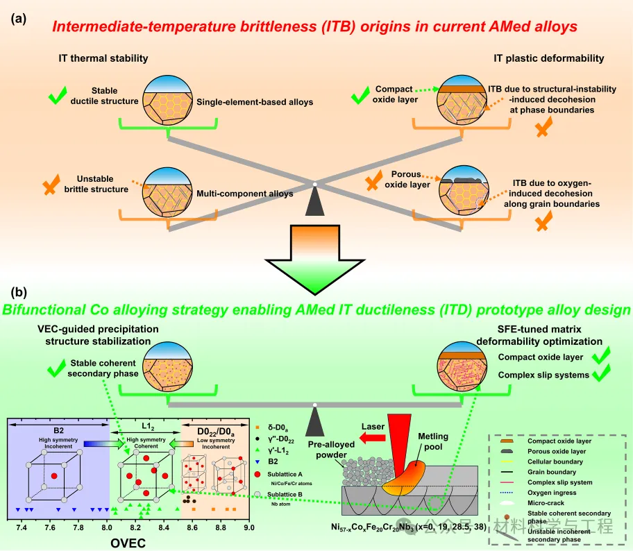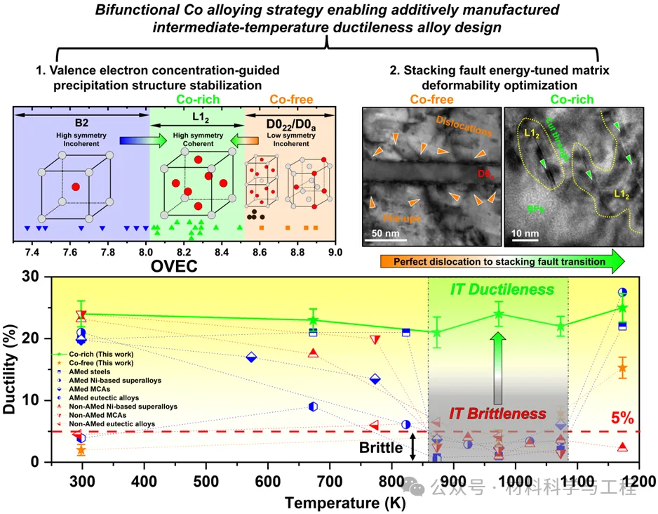 近期,由新加坡国立大学、香港城市大学、南洋理工大学、上海交通大学、清华大学等单位合作的研究团队,在国际顶级材料期刊Acta MaterialiaIF=9.32026, 308, 121992)发表最新研究成果,提出基于价电子浓度(VEC)引导的钴双效合金化设计策略,成功攻克增材制造多组元合金的中温脆性难题。该策略通过钴合金化同时调控合金的析出路径和基体变形能力,实现了中温脆性向中温塑性的动态转变,所制备的富钴多组元合金在 700°C 下实现 1032 MPa 的极限抗拉强度和~24% 的延伸率,强塑协同性能远超现有增材制造合金体系,为下一代耐中温高性能结构合金的设计提供了全新范式。