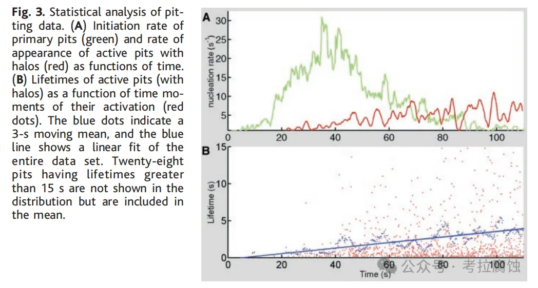 在图3A中,初级点蚀和高活性点蚀(带晕)的出现速率作为时间函数显示。在特征为总电流快速增加的初始阶段,出现了许多点蚀。然而,随着饱和接近,新点蚀停止出现。表面显然仅具有固定数量的点蚀成核部位——即在缺陷和夹杂部位。当所有此类部位耗尽时,仅能发生先前形成的点蚀的重新激活。所有相对强点蚀(在图2中标记为红色星)的寿命(活性持续时间)通过视频数据的计算机处理确定。在图3B中,这些寿命显示为相应点蚀活性开始时间函数。虽然所有此类点蚀都是亚稳的,但它们的寿命缓慢增长。我们还分析了点蚀数量饱和后点蚀之间最近邻距离的分布,发现一个几微米宽的狭窄排除区,与之前反应终止后的统计调查一致。