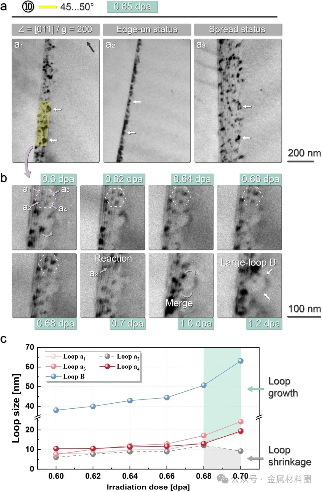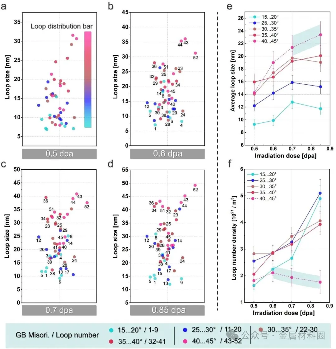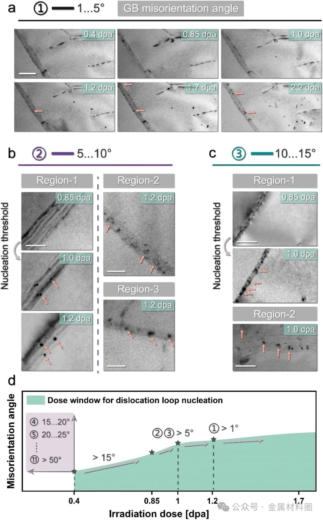 图2:系统研究了不同取向差晶界处位错环形核的辐照剂量窗口。图2a-c分别展示了取向差为1-5°、5-10°和10-15°的晶界附近位错环的原位演化过程,证实了形核阈值的存在。图2d总结了不同取向差晶界处位错环形核与辐照剂量的关系图,明确指出位错环在晶界处的形成不仅与取向差相关,也与辐照剂量紧密相关。