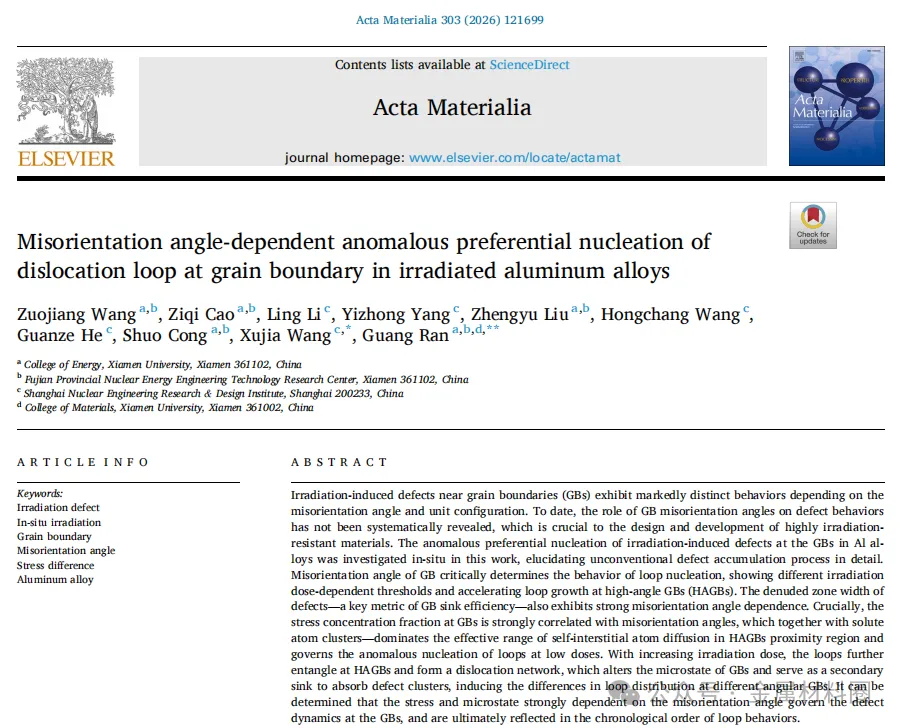 厦门大学 | Acta Mater. | 贫化区消失之谜:Acta Mater报道,铝合金>25°晶界处,辐照缺陷为何“拒绝清净”?