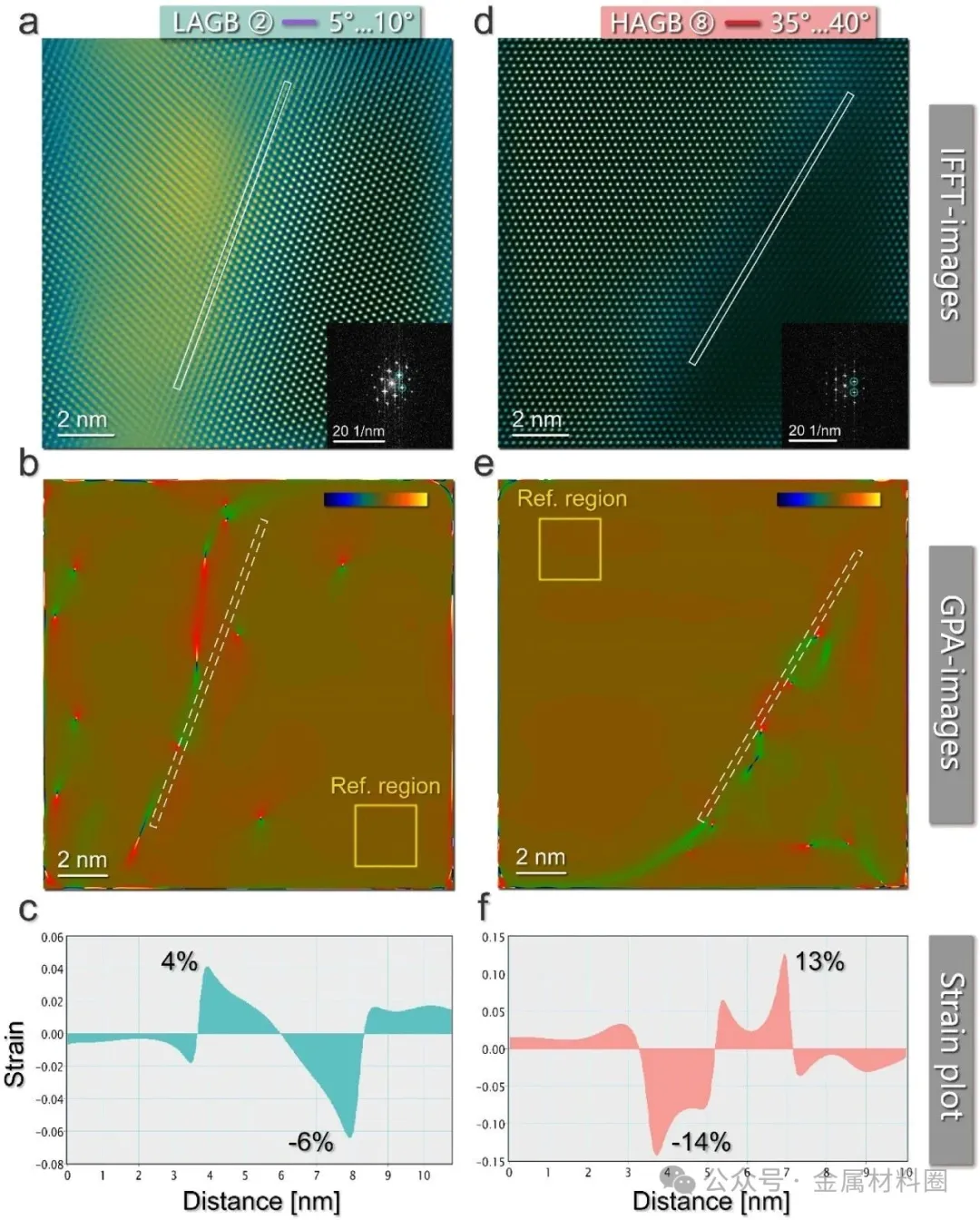 图3:分析了位错环在五个高角度晶界(>15°)附近的生长行为。图3a-d追踪了每个晶界附近多个标记单环的尺寸随剂量的演化,统计显示较大取向角的晶界出现大尺寸环的频率更高,生长速率也更快。图3e和3f则统计了相同区域内(包含一个晶界)位错环的平均尺寸和数密度随剂量的变化,揭示了环的尺寸增长与数密度增加之间的竞争关系。图4:通过改变衍射条件,验证了辐照诱导位错环确实位于晶界上。图4a显示当晶界处于刃型状态、完全展宽等不同形态时,位错环均随机分布在晶界上。图4b原位展示了晶界上位错环典型的生长和合并过程。图4c跟踪了图4b中几个标记环的尺寸变化,表明即使在晶界区域,位错环之间仍可发生合并。图5:对比了低角度与高角度晶界附近缺陷贫化区的差异。图5a和b的弱束暗场像清晰地显示了基体中小尺寸缺陷簇的存在,再次证明了位错环在晶界处的优先形成。图5c和d显示在1.2 dpa时,1-5°的低角度晶界附近存在缺陷贫化区,而高角度晶界(GB-11)右侧则没有明显的贫化区。图5e和f进一步说明了低角度晶界附近的缺陷贫化区宽度随辐照剂量增加而变窄的趋势。图6:将本研究观察到的缺陷贫化区宽度数据与文献中报道的不同晶体结构金属及合金的数据进行了对比分析。结果表明,贫化区的形成与材料晶体结构无关,但本研究中发现取向角超过25°的晶界表现出完全的贫化区抑制,凸显了晶界宏观与微观状态依赖的辐照损伤容忍度。图7:通过几何必要位错密度图和示意图,分析了晶界取向差与应力集中的关系。图7a-c显示了标记的低角度和高角度晶界区域典型的应变水平。图7d表明GND密度随晶界取向角增加呈非线性增长,在10°和40°附近出现跃升。图7e示意图表明,高角度晶界区域具有更扩展的应力集中分数,能提供更宽的应力梯度驱动自间隙原子向晶界输运。图8:利用几何相位分析法获得了典型低角度和高角度晶界在辐照前的应变分布。图8a和d分别为过滤后的低角度和高角度晶界高分辨像的逆傅里叶变换图。图8b-f展示了通过GPA提取的应变(sxy)分布图及对应的线扫描曲线。结果表明,高角度晶界区域的应变波动范围更大,这与更高的应力集中状态相符。图9:通过建模和示意图阐述了晶界特性对缺陷优先形核的机理。图9a示意图描述了自间隙原子扩散模式与距晶界距离的关系。图9b基于Arrhenius公式估算了373 K下不同取向差晶界处的原子扩散系数,显示高角度晶界的扩散速率比低角度晶界高1-2个数量级。图9c-d和e示意图综合了扩散机制和晶界特性的影响,分阶段(优先形核、形成位错网络、作为二次缺陷阱)阐释了不同辐照阶段晶界处位错环分布模式的控制机制。图10:重点讨论了辐照诱导的位错半环演化及其与晶界的相互作用。图10a展示了在2.2 dpa下,不同晶界(GB-2和GB-8)处的位错形态差异。图10b给出了存在大型位错半环的高角度晶界两侧晶粒的取向关系。图10c1-c2示意图描绘了紧邻晶界的位错半环形成、生长以及其滑移面随辐照剂量发生旋转的过程。图11:通过示意图总结了低角度与高角度晶界附近缺陷聚集和贫化区形成过程的差异。图11a和b示意性地对比了在低角度和高角度晶界邻近区域,随着辐照剂量增加(Dose-1至Dose-3),位错环形核、生长、形成网络,并最终影响贫化区特征的不同路径。