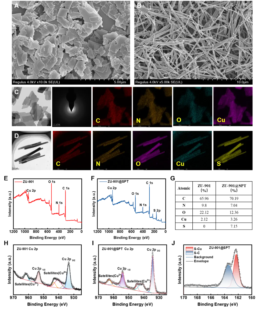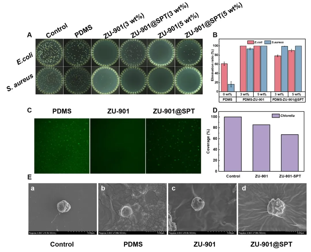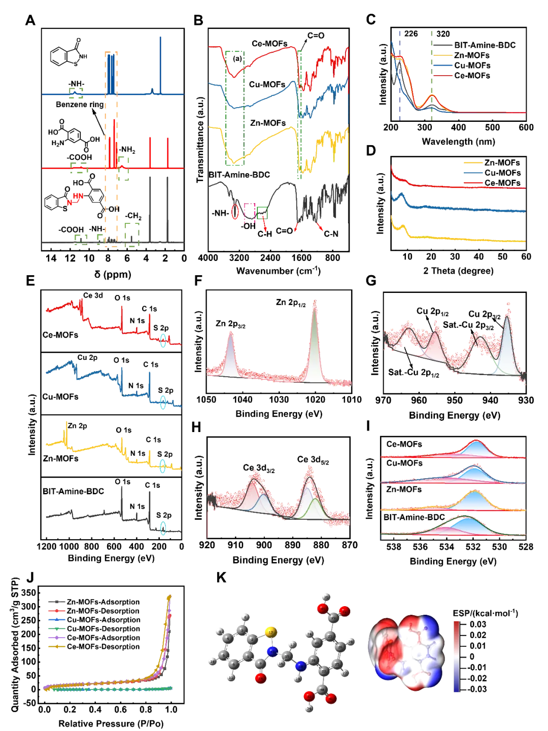 1. BIT-Amine-BDC 配体及 M-MOFs 的制备首先,通过Mannich反应,将商业化抗菌剂1,2-苯并异噻唑啉-3-酮(BIT)接枝到2-氨基对苯二甲酸上,合成具有本征抗菌活性的新型配体BIT-Amine-BDC。随后,将该配体分别与Zn²⁺、Cu²⁺、Ce³⁺金属离子进行溶剂热反应,自组装构建系列M-MOFs(M=Zn, Cu, Ce)抗菌材料。采用配体交换策略,将柱撑结构MOF材料ZU-901浸渍于广谱抗菌剂吡啶硫酮钠(SPT)溶液中。通过Cu-S配位键的作用,将SPT分子稳定封装于ZU-901骨架中,成功制得功能化MOFs抗菌材料ZU-901@SPT。1.M-MOFs(M:Zn、Cu、Ce)通过超声分散和机械混合与水性丙烯酸树脂混合,粉末质量比分别为0 wt%、3 wt%和5 wt%。2. PDMS基杂化涂层的合成步骤如下:将ZU901和ZU901@SPT超声处理30分钟以形成均匀悬浮液,将该悬浮液与羟基硅油混合并在室温下机械搅拌1小时,使填料在硅油相中均匀分散;随后依次加入正硅酸乙酯(TEOS)和有机锡催化剂(如二月桂酸二丁基锡,DBTL),严格控制羟基硅油、正硅酸乙酯与催化剂三者的质量比为90:10:1,填料添加量为最终复合材料总质量的3 wt%或5 wt%;将体系在室温下持续机械搅拌至混合均匀,随后在室温下固化24–48小时以保证其硬度。使用扫描电子显微镜(SEM)和透射电子显微镜(TEM)观察材料微观形貌与结构。通过X射线衍射(XRD)和X射线光电子能谱(XPS)分析晶体结构与元素化学态。采用紫外-可见吸收光谱(UV-vis)和傅里叶变换红外光谱(FTIR)评估光学性质与官能团变化。通过热重分析(TGA)和氮气吸附-脱附(BET)测定热稳定性与孔结构特性。采用抑菌圈法(ZOI)和最小抑菌浓度(MIC)评估抗菌活性,通过平板菌落计数计算抑菌率。利用扫描电镜(SEM)观察细菌形貌变化,采用结晶紫染色和激光共聚焦(CLSM)活/死染色分析抗生物被膜能力。通过藻抑制率测定和荧光显微镜评估抗藻性能。采用电子顺磁共振(EPR)检测活性氧生成。图 1 中的 ¹H NMR 和 FT-IR 光谱证实了 BIT 的成功修饰,随后利用该配体与 Zn²⁺、Cu²⁺、Ce³⁺三种金属离子配位,合成了相应的 Zn-MOFs、Cu-MOFs 和 Ce-MOFs,XPS 分析证实了金属离子与配体间的配位作用,N₂吸脱附曲线和 SEM/TEM 表征则揭示了 MOFs 的多孔结构和不同形貌(Zn-MOFs 呈层状堆积,Cu-MOFs 和 Ce-MOFs 为纳米颗粒),静电势(ESP)分布计算表明配体上带负电的羰基氧是优先与金属离子配位的位点。图1. BIT-Amine-BDC与M-MOFs(M:Zn、Cu、Ce)的表征结果。(A)¹H NMR谱图,(B) FT-IR光谱,(C) BIT-Amine-BDC与M-MOFs(M=Zn, Cu, Ce)的紫外-可见吸收光谱,(D) M-MOFs(M=Zn, Cu, Ce)的XRD衍射图谱,(E) BIT-Amine-BDC与M-MOFs(M=Zn, Cu, Ce)的XPS概览谱,(F) Zn 2p, (G) Cu 2p的高分辨XPS谱, (F) Zn 2p、(G) Cu 2p、 (H) Ce 3d 及 (I) O 1s 高分辨率光电子能谱,(J) M-MOFs (M:Zn, Cu, Ce)的N₂吸附-脱附等温线,(K) BIT-Amine-BDC的静电势分布图。图 2 A-D 释放实验表明 M-MOFs 能持续释放抗菌配体和金属离子,其中 Zn-MOFs 的累积释放周期长达 38 天,平板菌落计数法证实 Cu-MOFs 在 0.025 mg/mL 的低浓度下 12 小时内即可实现对大肠杆菌的 100% 杀灭,表现出最优异的抗菌性能,抗藻实验显示 0.1 mg/mL 的 M-MOFs 对小球藻的抑制率超过 70%。图2. BIT-Amine-BDC及M-MOFs(M:Zn、Cu、Ce)的长期体外抗菌活性评价。(A) 标准BIT-Amine-BDC的校准曲线(通过紫外-可见光谱测定);(B–D) 其从M-MOFs(M:Zn, Cu, Ce)中的释放曲线;(E, F) 含0.1 mg/mL BIT-Amine-BDC的培养基中,12小时及24小时培养的大肠杆菌菌落形成单位(CFU)计数BIT-Amine-BDC与M-MOFs(M:Zn、Cu、Ce)的释放曲线;(E、F)大肠杆菌、(G、H)金黄色葡萄球菌、(I、J)铜绿假单胞菌经12小时及24小时培养后的灭菌效率定量评估;(K)M-MOFs(M:Zn、Cu、Ce)处理藻类的杀灭率;(L)M-MOFs(M:Zn、Cu、Ce)处理藻类的扫描电子显微镜图像。图 3 涂层抗菌测试结果表明,添加 5 wt% M-MOFs 的杂化涂层在 4 小时内对大肠杆菌的杀灭率均超过 94%,其中 Cu-MOFs 和 Ce-MOFs 达到 100%,对金黄色葡萄球菌的杀灭率分别达到 99.1%(Zn-MOFs)、100%(Cu-MOFs)和 88.1%(Ce-MOFs),抗藻实验显示经 5 天浸泡培养后,5 wt% M-MOFs 杂化涂层表面的小球藻绿色荧光信号显著减弱,SEM 图像显示藻细胞出现明显的破裂和崩解,而空白对照组藻细胞形态完整,证实了杂化涂层优异的抗藻附着性能。图3. M-MOFs混合涂层(M:Zn、Cu、Ce)的抗菌与抗藻性能评估。(A) 菌落形成单位(CFU)计数与 (B)经M-MOFs混合涂层孵育后细菌灭菌效率的定量评估,(C) 共聚焦显微镜图像与 (D) 扫描电子显微镜图像显示小球藻与纯涂层及5 wt% M-MOFs防污涂层共培养5天后的状态。图 4 采用 L929 小鼠成纤维细胞,通过 CCK-8 法、Annexin V/PI 流式细胞术和活 / 死细胞染色激光共聚焦显微镜系统评估了 BIT-Amine-BDC 及 M-MOFs 的细胞相容性,CCK-8 结果显示材料对细胞的毒性呈现浓度依赖性,在 26 μg/mL 浓度下,Ce-MOFs 处理 24 小时后细胞存活率仍达 80%,表现出优异的生物相容性,而 Zn-MOFs 和 Cu-MOFs 在该浓度下细胞存活率降至 20% 左右,活 / 死细胞染色进一步证实在 13 μg/mL 浓度下,Ce-MOFs 处理组几乎观察不到红色荧光(死细胞),绿色荧光强度接近对照组水平,流式细胞术定量分析表明 13 μg/mL Zn-MOFs 处理组诱导了大量细胞晚期凋亡(Q2 象限 28%),而 BIT-Amine-BDC(5.34%)、Cu-MOFs(6.61%)和 Ce-MOFs(0.87%)对细胞凋亡的影响较小,三种 MOFs 的生物相容性顺序为 Zn-MOFs < Cu-MOFs < Ce-MOFs。综上所述,所制备的系列 M-MOFs 及基于其构筑的杂化涂层均展现出优异的抗菌与抗藻性能。图4. BIT-Amine-BDC及M-MOFs(M:Zn, Cu, Ce)的生物相容性评估。(A-D) L929细胞经不同浓度样品处理24小时后的