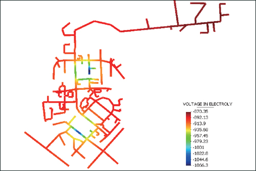 燃气管网的区域性阴极保护技术是将某一区域内的所有燃气管网当作一个整体来进行保护,由于保护区域内保护对象繁多、地下管网分布复杂、范围较小,给辅助阳极地床的设计带来较大的困难。近年来,随着电化学和计算机技术的发展,人们尝试采用数值计算技术来处理复杂条件下的阴极保护优化设计。该技术为解决燃气管网的区域阴极保护设计问题提供了有效的解决途径。将数值模拟预测与优化技术应用于燃气管网阴极保护设计中,通过计算阴极保护电位和电流密度的分布,来评价保护效果,优选保护方案,确定合理的阳极种类、形状、数量、位置等参数,可大大提高燃气管网阴极保护的设计水平。