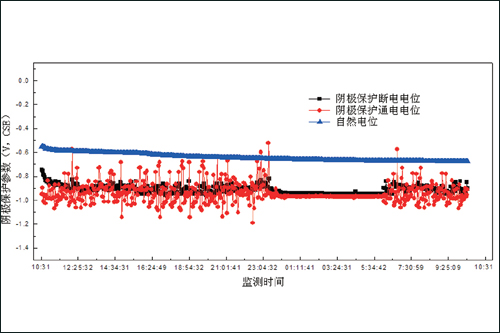 图5 采用极化探头测得的地铁干扰区管地通电电位及试片断电电位