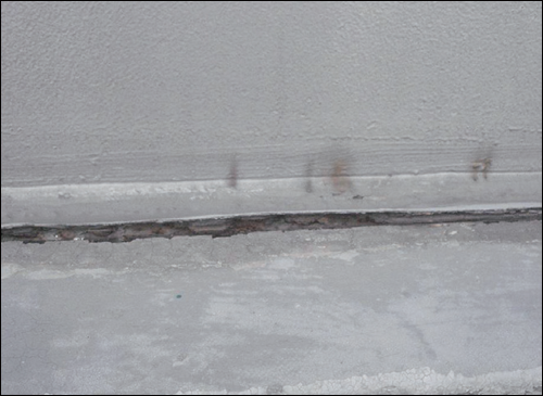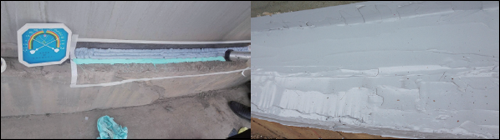 CTPU 防水涂料是目前储罐边缘板防腐较为常用的方法,它具有防水效果好,固化后与混凝土、钢材的黏结性能良好,能够形成完整的防水涂层等优点;但由于其属于多组分涂料,需要根据现场的环境温度对其各组分的比例进行调整,施工较为复杂,现场施工容易出现鼓泡、发脆、粉化开裂等问题。图5 是大港油田某储罐边缘板采用CTPU 防水涂料进行防腐处理5 年后的情况。从图中可以看出,防水涂层外观基本没有破坏,但表面有龟裂,水泥基台上的涂层有部分剥落,结合缝处有锈蚀的斑点,从斑点处拨开,发现内部已经出现锈蚀。因而, CTPU 的防腐方案还有待进一步改进。