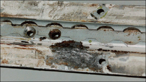 据2002 年中国对飞机腐蚀调查,我国的飞机结构普遍存在的电偶腐蚀问题表现在下述区域: (1) 绝大部分的飞机后货舱地板与地板梁搭接处的电偶腐蚀;(2) 大部分飞机的机腹下部天线与机腹的搭接处等结构件与连接件的电偶腐蚀。