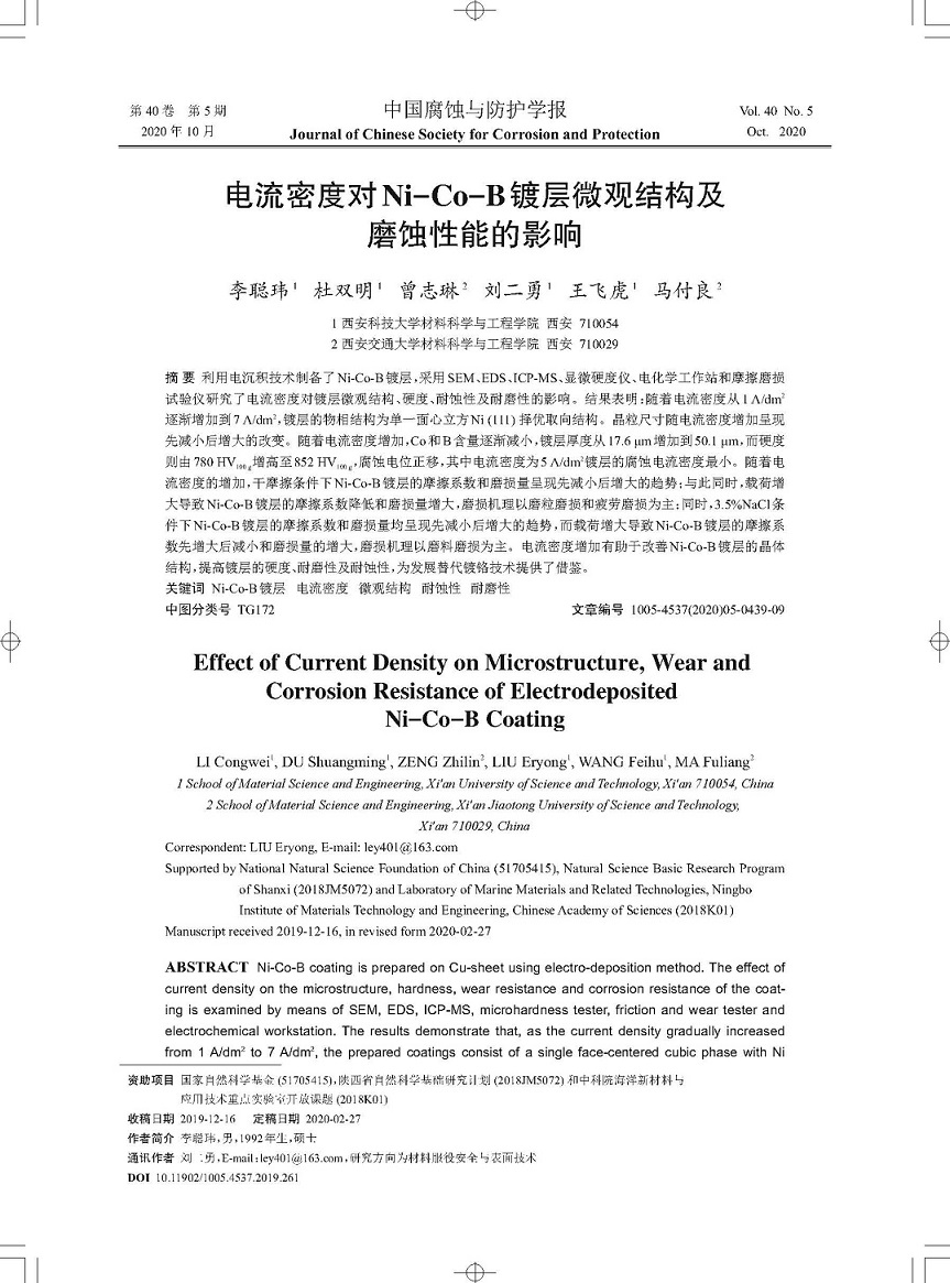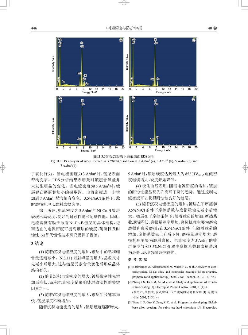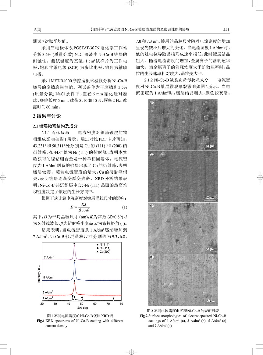 电流密度对Ni-Co-B镀层微观结构及磨蚀性能的影响