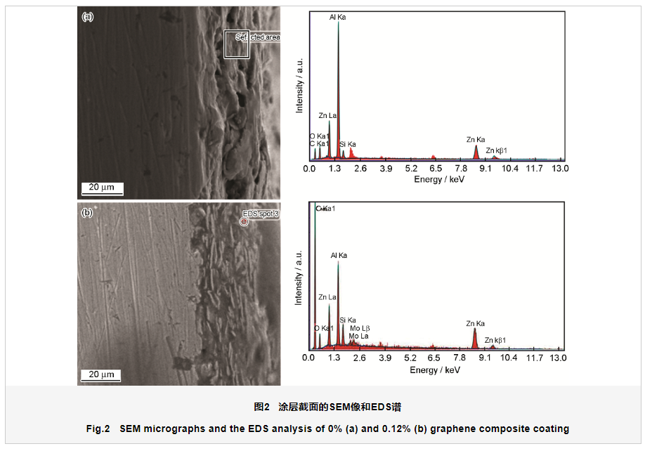 图1为不同石墨烯添加量无铬达克罗涂层SEM形貌。从图1中可以看出,各涂层表面较为平整,片状锌粉、铝粉片径大约从5~25 ?m不等,分布均匀致密,无明显孔洞和裂缝,在整个防腐过程中提供初步的阻挡作用。图中部分片状金属粉末会呈现亮白色的边缘,经EDS检测此处多为铝以及铝的氧化物,这是因为铝的吉布斯自由能ΔG比锌低,更容易被氧化,从而产生不导电的氧化物,故在扫描电镜下呈亮白色[13]。从图中还可以看出,加入石墨烯粒子前后涂层的表面没有明显变化,说明添加石墨烯粒子不会影响膜层的形貌特征。图2为0%石墨烯增强涂层与0.12%石墨烯增强涂层的截面图以及EDS谱。由图可知,涂层与基体结合较好,厚度大约为30~40 ?m之间。从图2b中能清晰的看到片状铝粉几乎与基体平行,层层相叠。结合EDS分析结果可知,0.12%石墨烯增强涂层中C的净强度远高于0%石墨烯增强涂层,说明在0.12%石墨烯增强涂层中该位置有明显的C,且极有可能为石墨烯。