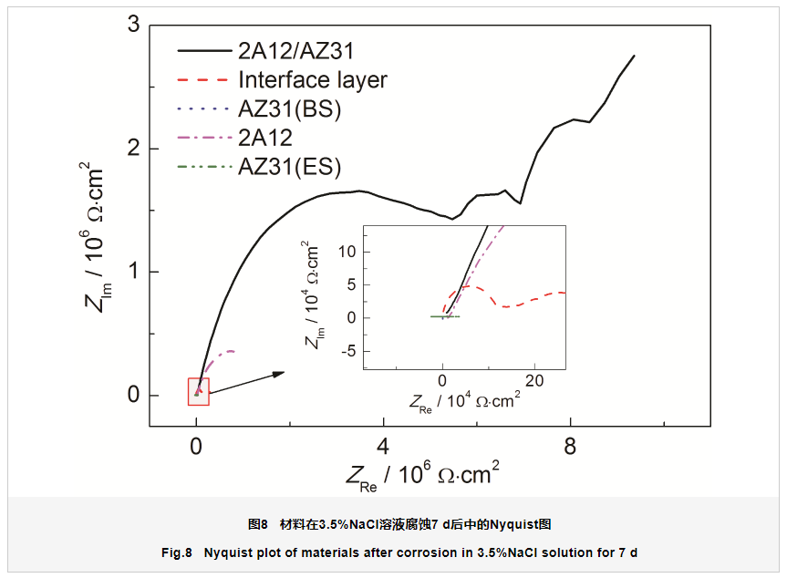 图7和8是材料在3.5%NaCl介质溶液中腐蚀前后的Nyquist图可以看出,在刚开始腐蚀的时候,2A12铝合金和2A12/AZ31包覆合金棒材的Nyquist图表现为一个容抗弧,随着腐蚀的开始,表现出半无限扩散状态,呈现出典型的Warburg阻抗直线,而中间界面层、AZ31(BS) 和AZ31(ES) 镁合金呈现阻挡扩散层,在经过7 d的腐蚀后,2A12/AZ31包覆合金棒材和2A12铝合金呈现出半无限扩散状态,中间界面层呈现出有限层扩散,而AZ31(ES) 和AZ31(BS) 镁合金继续呈现出阻挡扩散层,出现这些现象的原因可能是,呈现半无限扩散状态是由于扩散通道完全被打通;呈现有限层扩散,可能是由于Cl-不断溶解表面氧化膜,不断打通氧化膜的扩散通道,从而引起有限层的扩散;当呈现阻挡层扩散时,是因为腐蚀产物大量堆积[20],填满通道阻碍粒子传输[21],表现出晶间腐蚀状态特征。