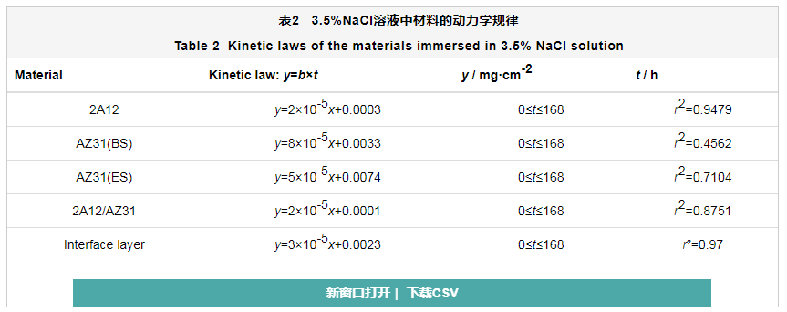 如表3所示,除了AZ31(BS) 镁合金材料外,其余材料在腐蚀后的开路电位比没有腐蚀 (初始状态) 要正得多,在未腐蚀前,铝合金包覆镁合金与铝合金的开路电位相差不大,说明包覆对保护镁合金有很好的防护作用。而界面层的开路电位与挤压态的镁合金相比,差距不大,可能是由于复合过程中界面层富集中间相,而挤压态的镁合金由于产生晶粒细化,造成晶间处富集铝镁中间相,具有比较好的耐腐蚀性能,而原始状态的镁合金其开路电位处于最负状态,说明其表面的氧化膜的保护性能非常差。在腐蚀7 d后,整体开路电位正移,其热力学状态与原始状态相比稳定性都有所提升。但是原始状态AZ31镁合金的开路电位正移不明显,这是由于镁合金是一种活泼的金属,在空气中易形成保护性氧化膜,但是此时的氧化膜在晶间或者孔隙处并不是完整、均匀的,具有较高的吉布斯自由能,造成热力学行为稳定性较差;而挤压态和界面层的热力学稳定性有很大的提升是由于腐蚀产物大量堆积在晶间或者晶体缺陷处,抑制了材料的腐蚀进度,从而提高热力学稳定性,这与文献[18]结论一致。2A12铝合金及2A12/AZ31是由于铝合金表面致密的氧化膜阻碍了腐蚀进程。