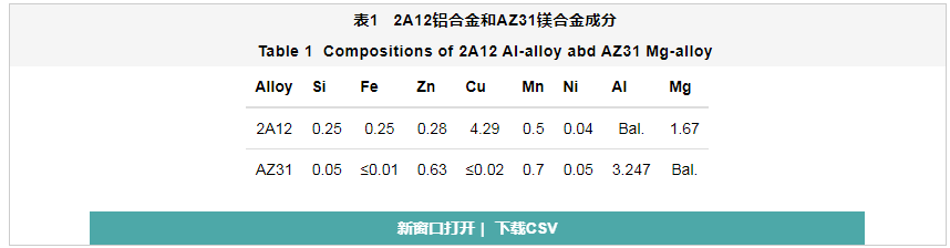 实验所用材料为2A12铝合金和AZ31镁合金,化学成分如表1所示。