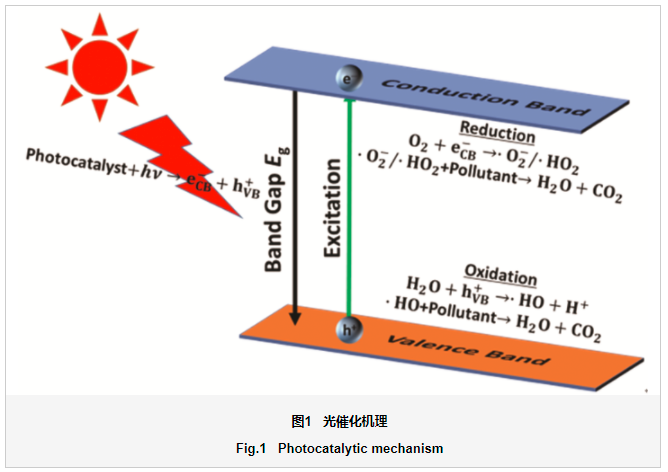 虽然并非所有的非均相光催化剂都是半导体,但迄今为止,这种类型的固体是最具代表性和广泛研究的光活性材料。半导体指电导率在金属电导率 (约104~106 Ω/cm) 和电介质电导率 (<10-10 Ω/cm) 之间的物质。与金属相比,半导体粒子的能带是不连续的。半导体在光激化下,电子从价带跃迁到导带位置,在导带形成光生电子 (e-),在价带形成光生空穴 (h+)。利用光生电子-空穴对的还原和氧化能力,可以光解水制备H2和O2,还原CO2形成有机物,还可以使O2或水分子激化成超氧自由基 (·O2-) 及羟基自由基 (·OH) 等具有强氧化能力的自由基,降解环境中的有机污染物、杀灭污损微生物等,不会造成资源浪费和二次污染 (图1)。