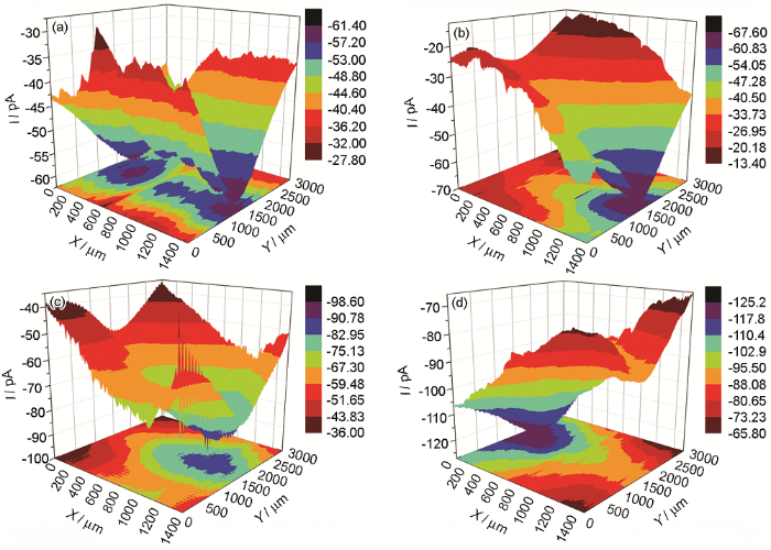 图6 不同交流电流强度和浸泡时间涂层缺陷处的探针扫描电流