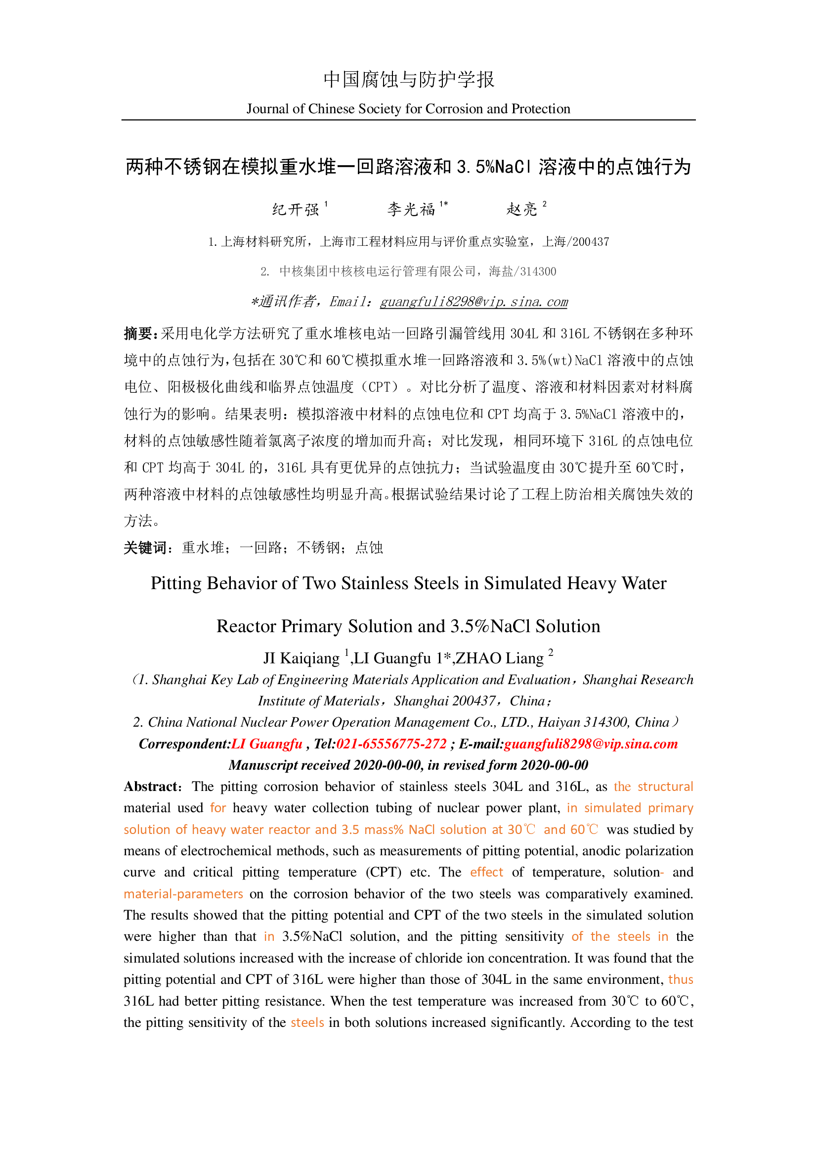 两种不锈钢在模拟重水堆一回路溶液和 3.5%NaCl 溶液中的点蚀行为