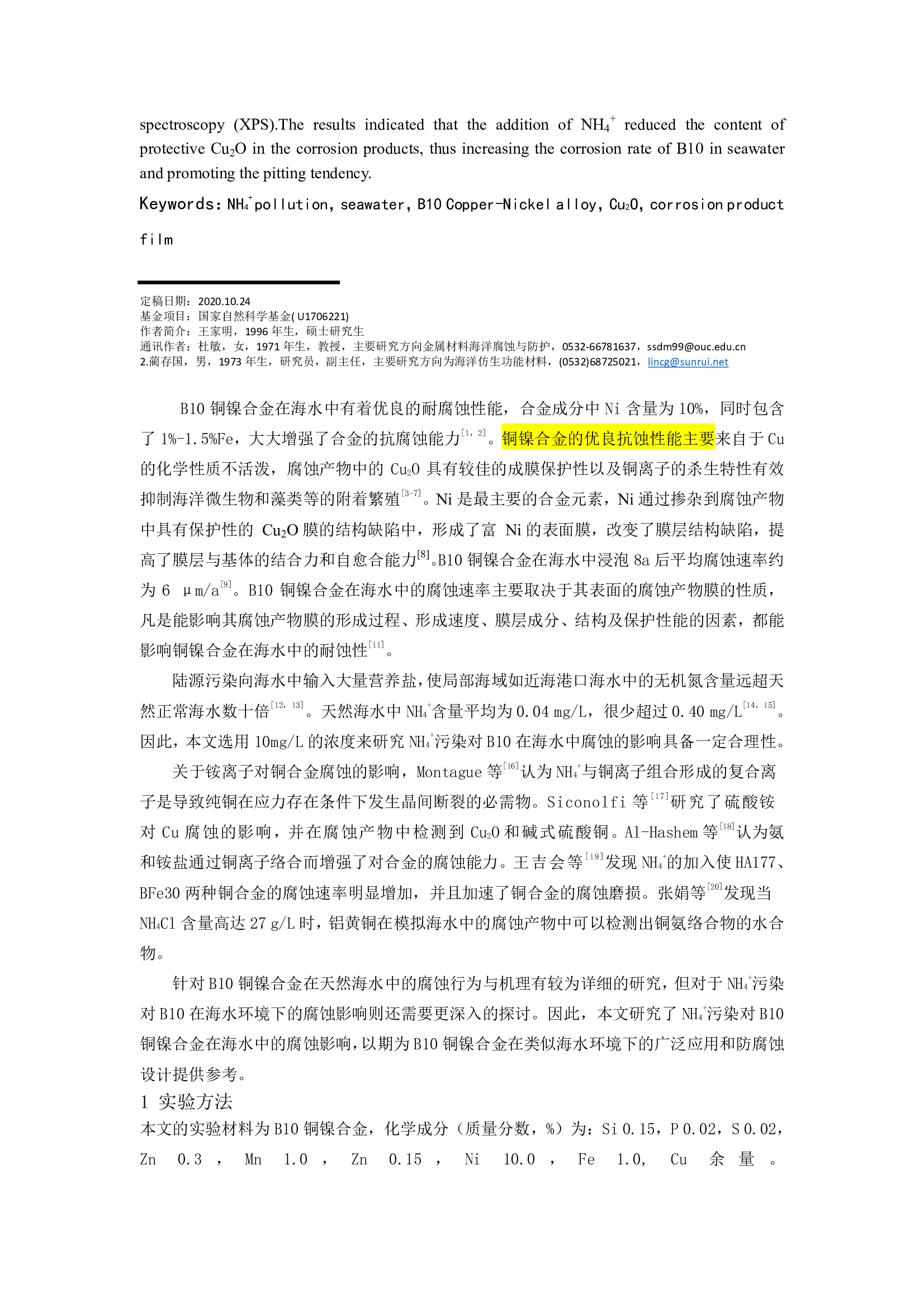 B10 铜镍合金在高浓度 NH4 + 污染海水中腐蚀研究