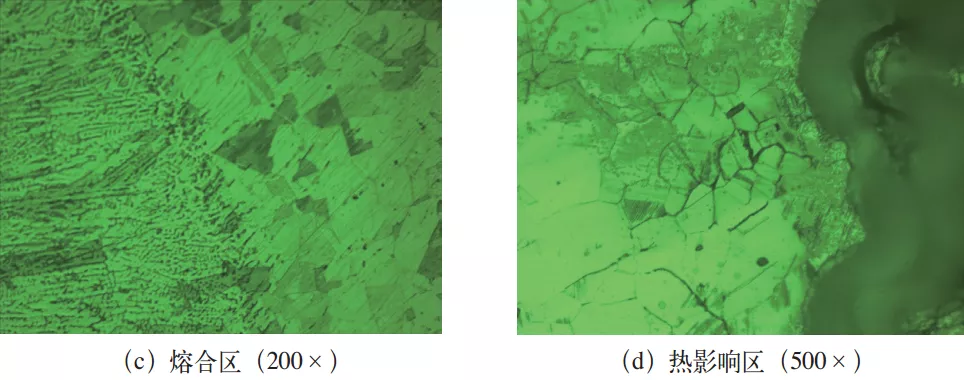 从渗液处(见图1c)截取试样,试样包括母材、焊缝和热影响区,对试样进行预磨、粗磨、精磨和抛光,使用OLYMPUS-GX51金相显微镜对试样进行非金属夹杂物观察,之后用三氯化铁盐酸水溶液对其浸蚀,在金相显微镜下对试样进行组织观察(见图2)。
