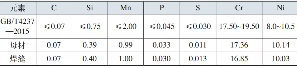 采用ARL-4460直读光谱仪分别对不锈钢管的母材及焊缝的化学成分进行检测,确定化学成分是否符合标准要求。