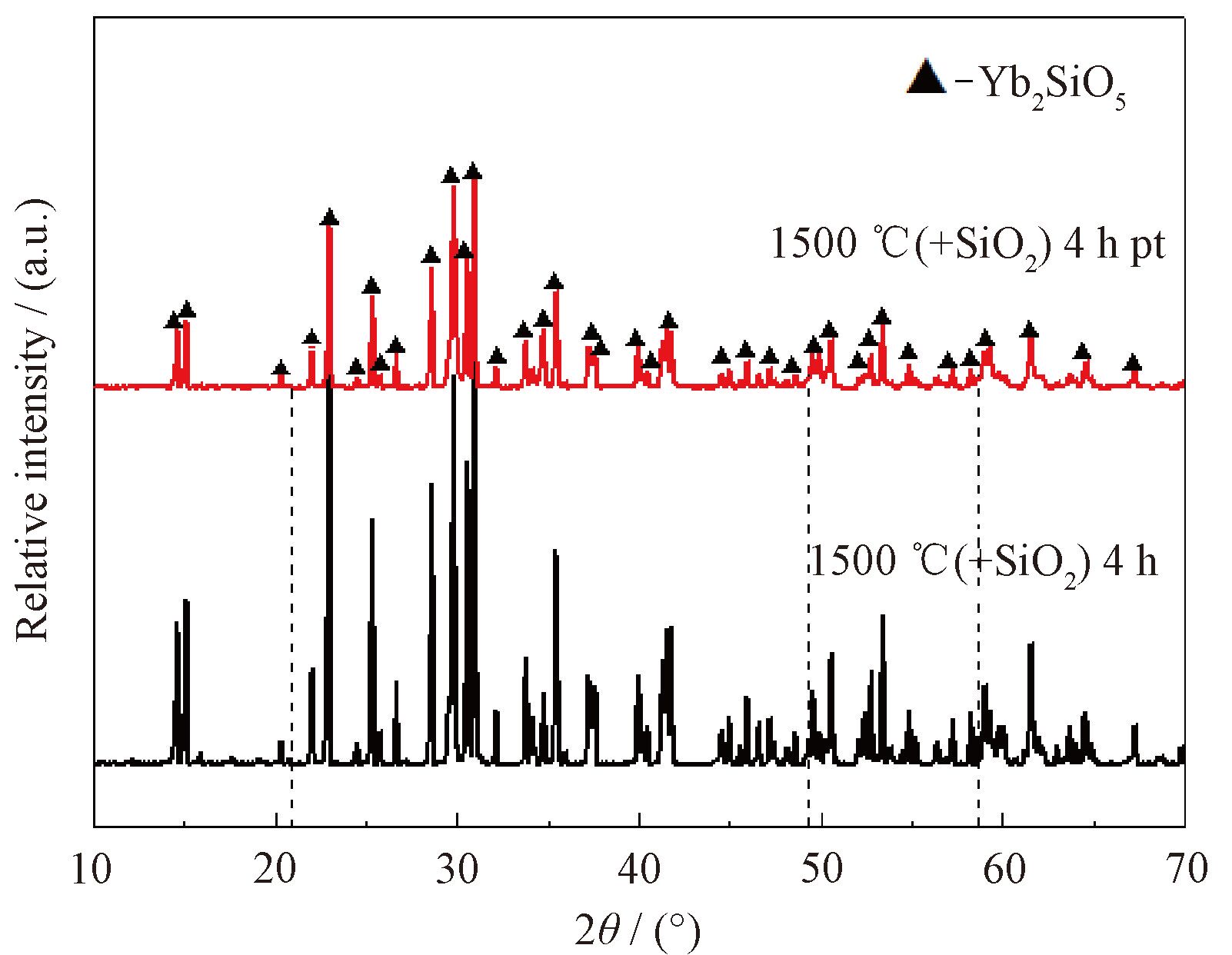 如图11所示为对纳米Yb2O3 +SiO2( +SiO2) 在1500℃ 保温4h后产物等离子处理前后的XRD图谱对比,标识pt为等离子处理后的喂料XRD。