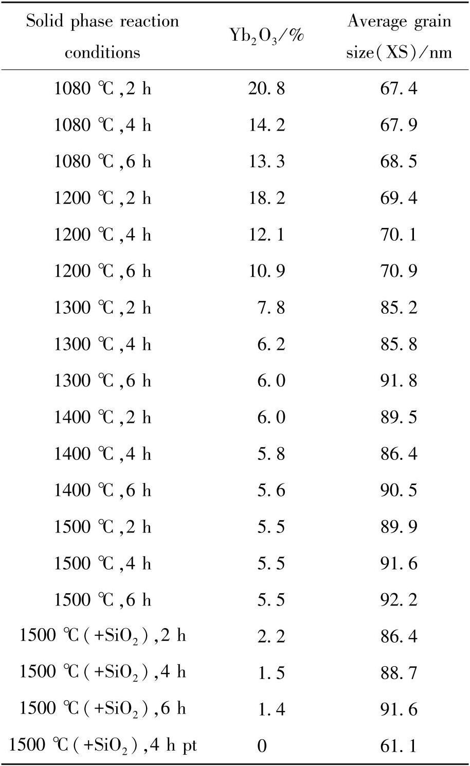 表4 纳米Yb2O3 +SiO2 在不同处理条件下产物分析