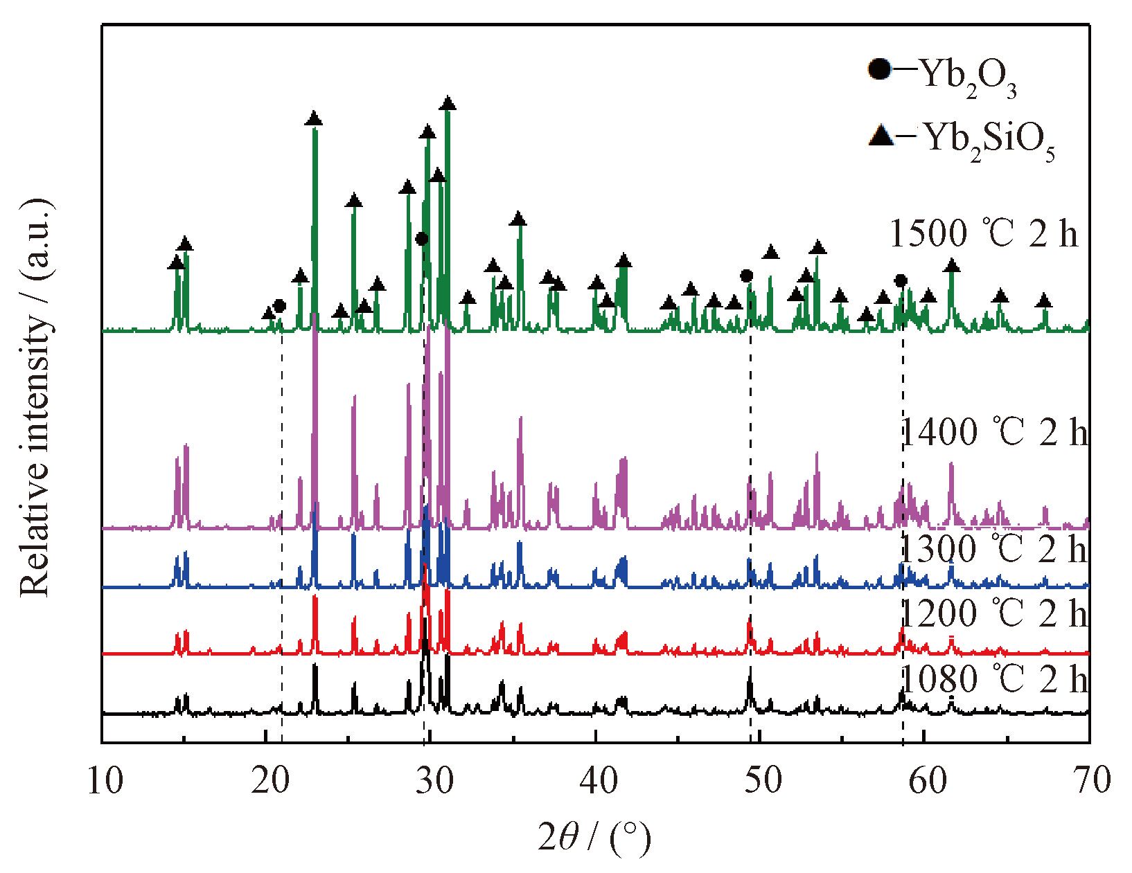 按照图7所示工艺曲线1、2、3、4、5以不同温度在马弗炉中加热纳米Yb2O3 +SiO2(1%PVA) 粉体。图8所示为纳米Yb2O3 +SiO2(1%PVA)在不同温度保温2h后产物XRD图谱,可以看出所有温度下固相反应后的主要产物为Yb2 SiO5 但都有不同含量的Yb2O3 未反应完全而留有剩余,随温度升高Yb2O3 剩余量越来越少。