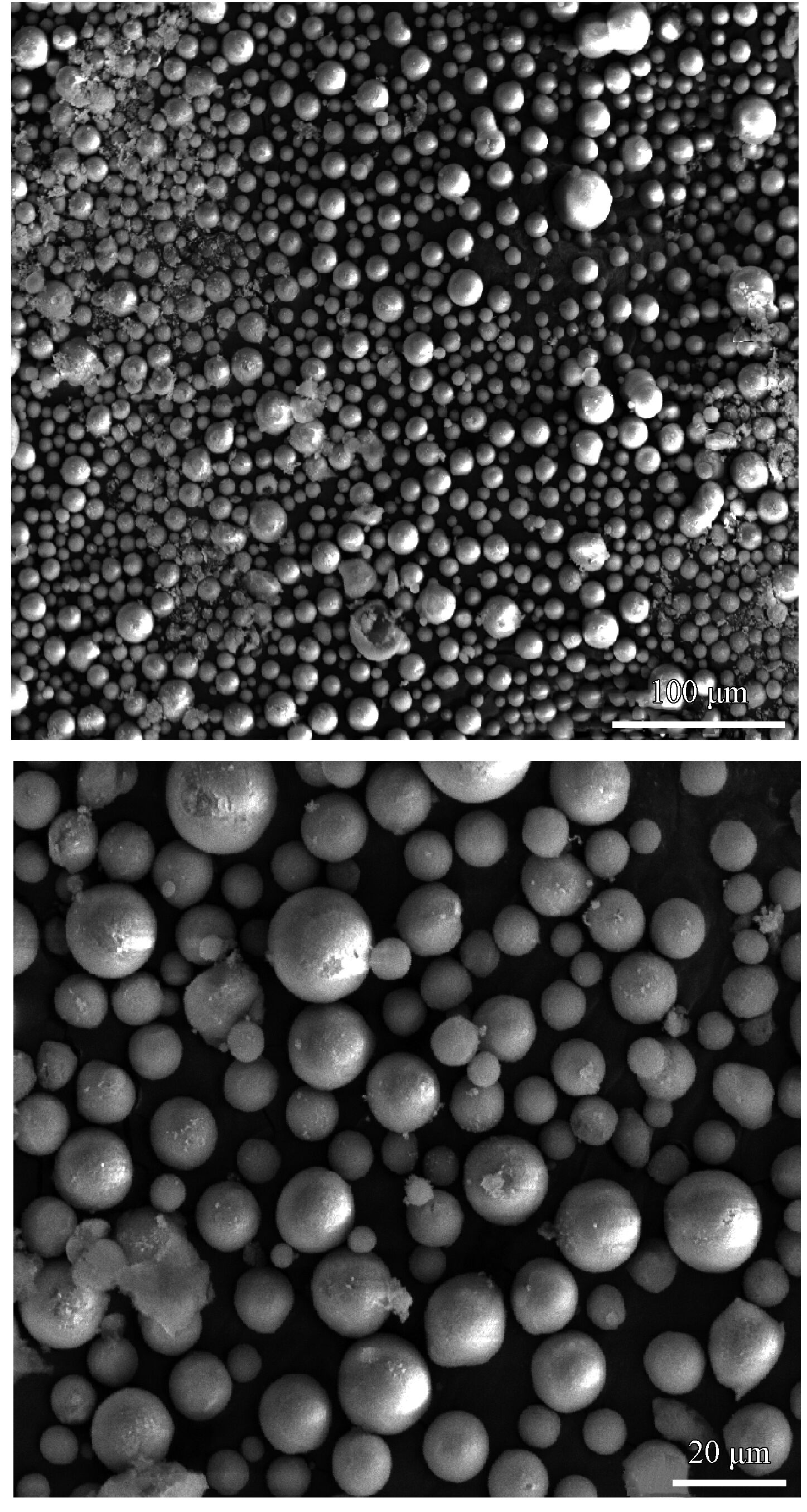 利用SEM观察喷雾造粒后粉体形貌如图5所示。从喷雾造粒后Yb2O3 +SiO2 的粉体形貌图中可以看出造粒后的纳米粉末很好地团聚在了一起,粉体粒径大致在十几微米到几十微米的范围,整体上粉体颗粒球形度较好,表面较为光滑, 符合喷涂要求。