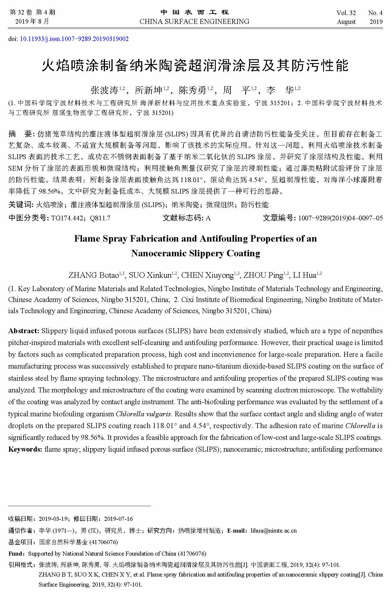 标签: 火焰喷涂, 灌注液体型超润滑涂层(SLIPS), 纳米陶瓷, 微观组织, 防污性能