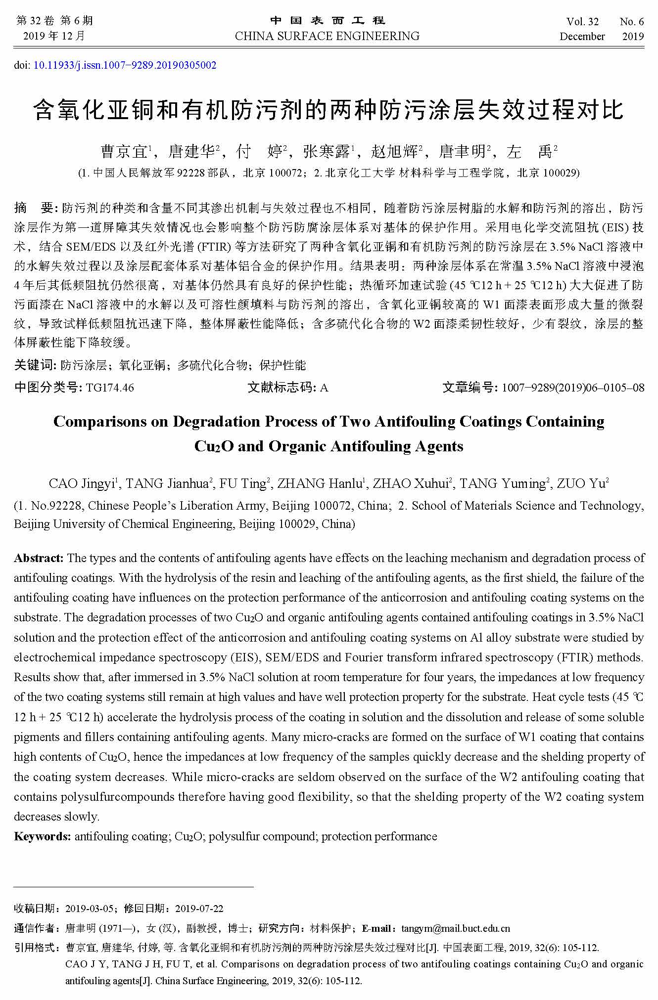 2021-07-01 16:10:11 作者:曹京宜,唐建华,付婷,张寒露,赵旭辉,唐聿明,左禹 来源:中国表面工程 分享至: