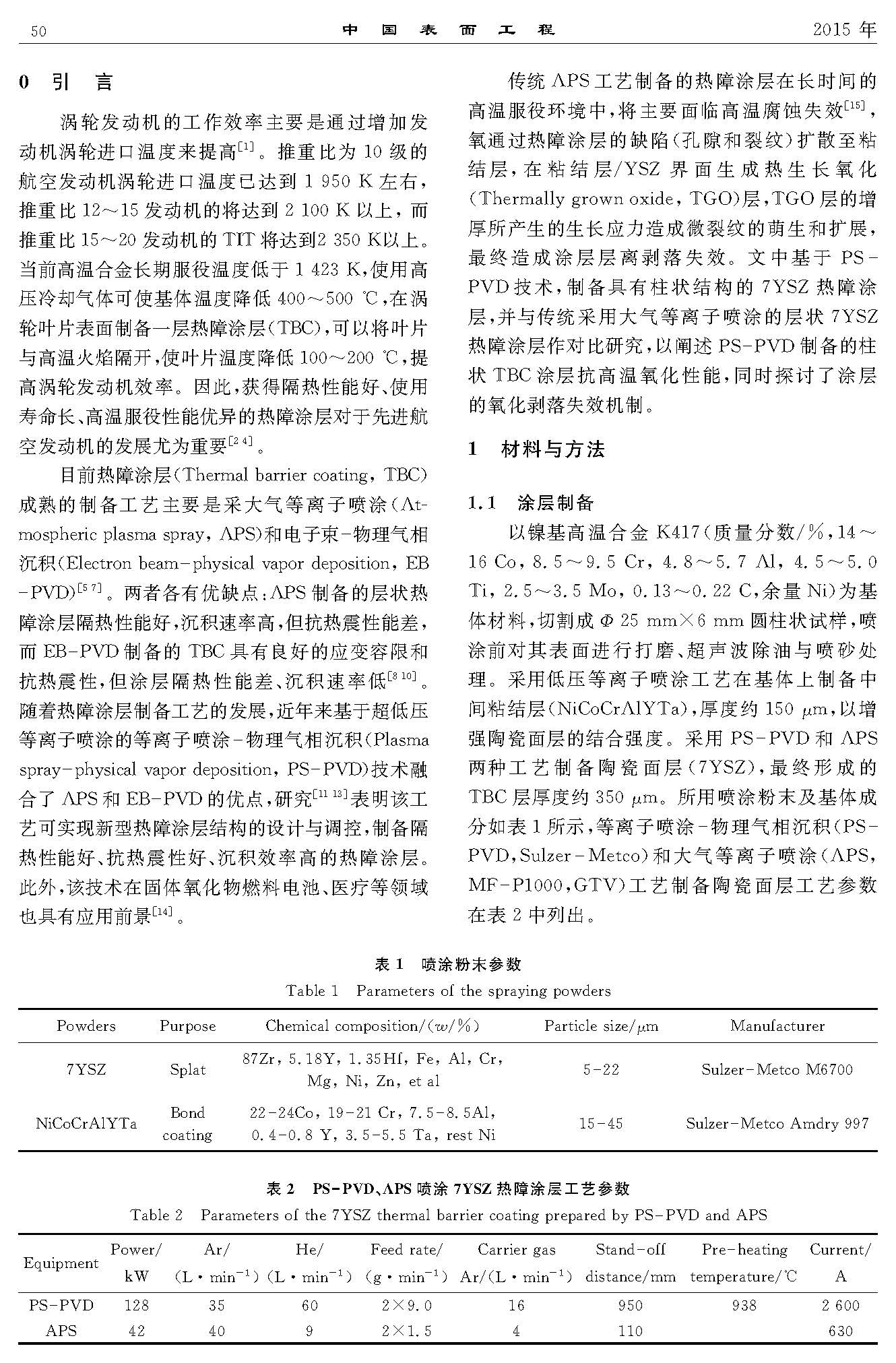 标签: 等离子喷涂物理气相沉积, 柱状晶YSZ, 高温氧化, 失效机制
