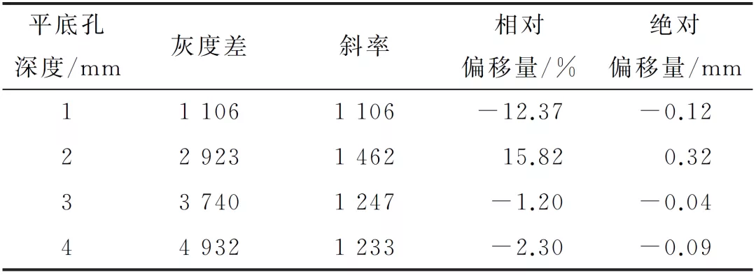 由曲线斜率k的计算公式k=ΔG/Δh(ΔG为灰度差,Δh为平底孔深度)得出平均斜率图片=1262,数据相对偏移量为-1.20%~15.82%,绝对偏移量为-0.12~0.32mm,数据统计结果如表4所示。