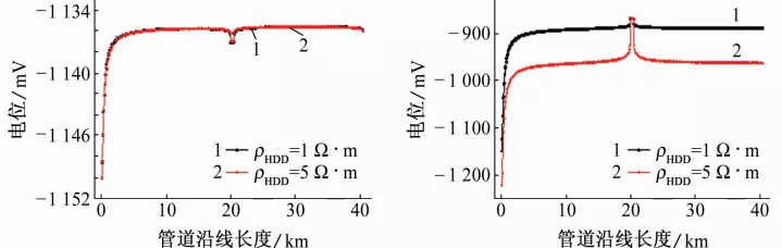 图8 穿越段土壤电阻率对管道电位分布影响的计算结果